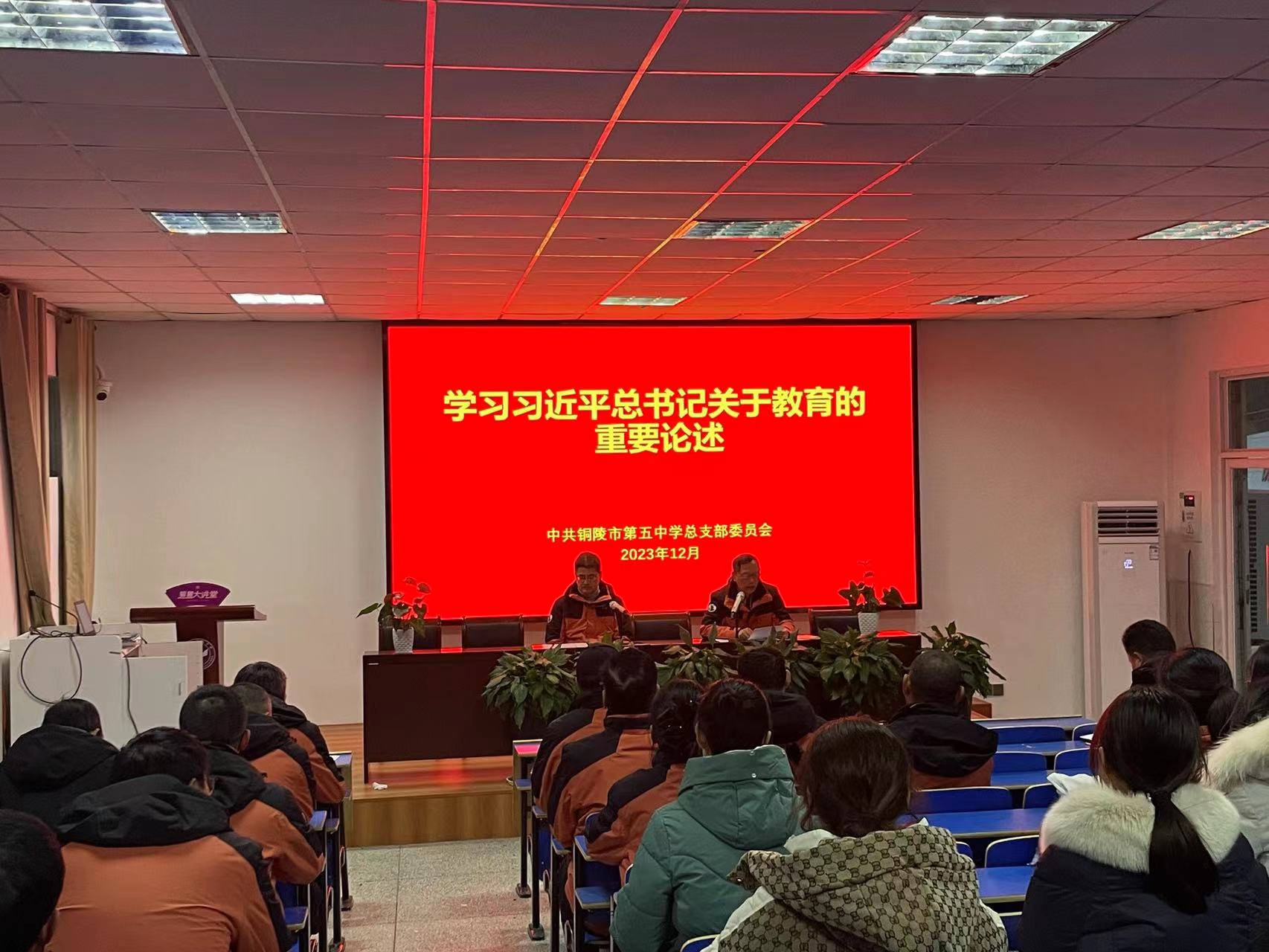 12月15日上午,市五中在獅麓大講堂召開黨員大會(huì),校黨總支委員、副校長(zhǎng)呂建國(guó)帶領(lǐng)全體黨員教師學(xué)習(xí)習(xí)近平總書記關(guān)于教育的重要論述。
