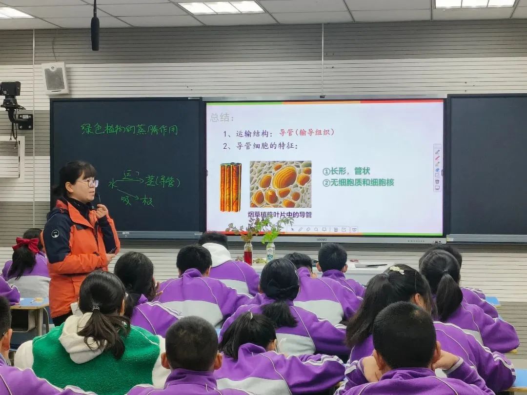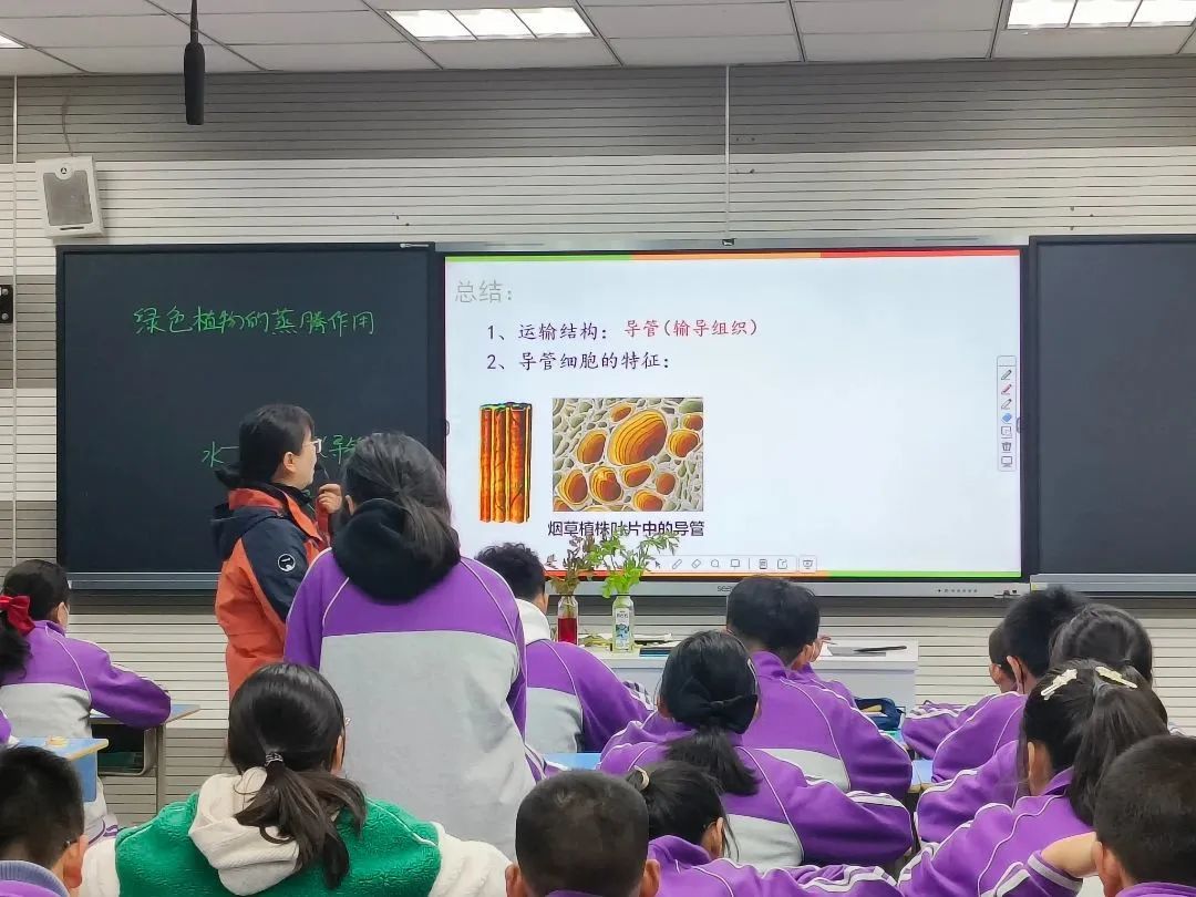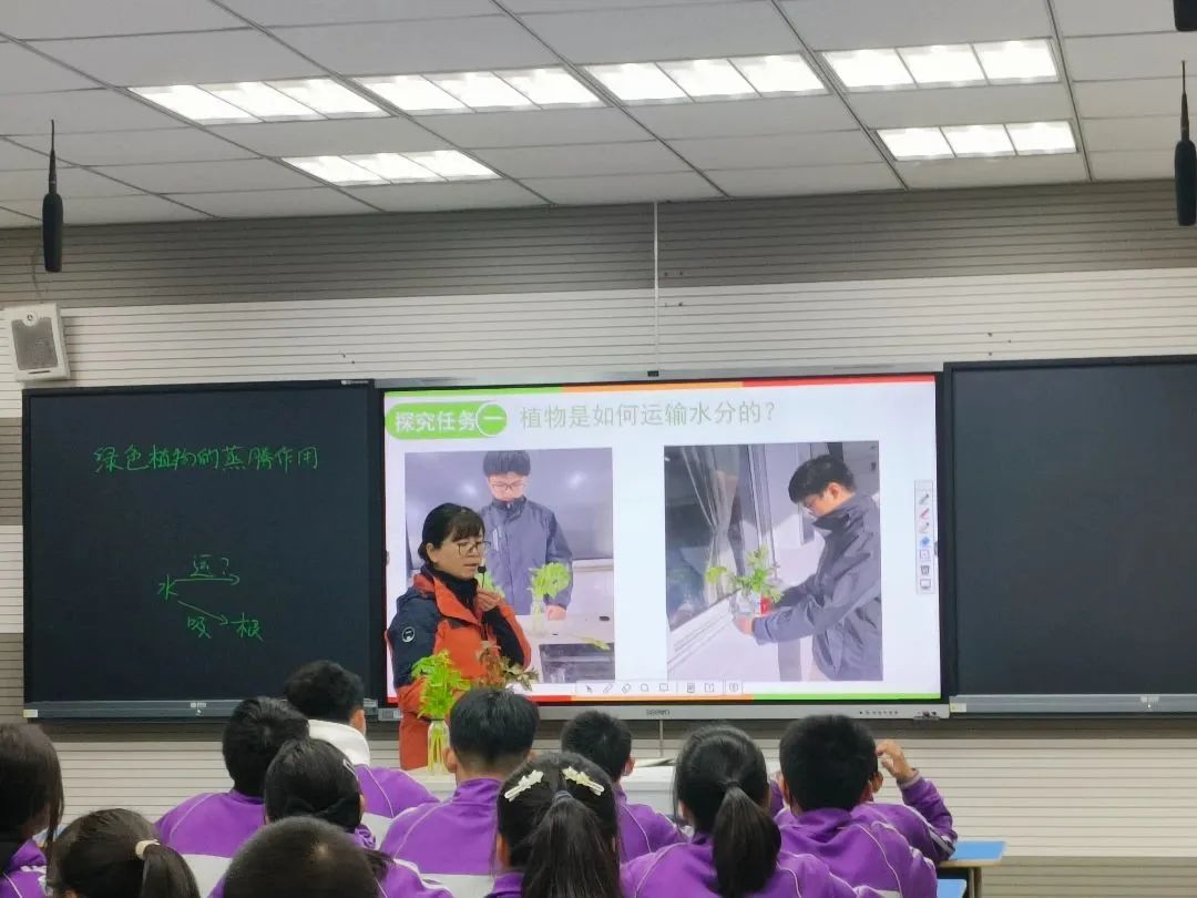 謝瑩老師以《綠色植物的蒸騰作用》為課題展示了一節(jié)精心設(shè)計(jì)的公開(kāi)課。她通過(guò)給綠蘿澆水的部位提出問(wèn)題:植物是怎樣吸收水分的?水分又是如何在植物體內(nèi)運(yùn)輸?shù)?植物吸收的水分大部分去了哪里?通過(guò)問(wèn)題驅(qū)動(dòng),自然引入課題。在本節(jié)課的教學(xué)過(guò)程中,謝老師主要通過(guò)實(shí)驗(yàn)方法滲透生物體結(jié)構(gòu)與功能相適應(yīng)的生物學(xué)觀點(diǎn),使學(xué)生逐步認(rèn)識(shí)到植物通過(guò)根吸收水、導(dǎo)管運(yùn)輸水、葉片蒸騰作用散失水等內(nèi)容。最后再把所學(xué)知識(shí)應(yīng)用到生活實(shí)踐中來(lái):“移栽幼苗時(shí)為什么要帶小土坨,還要剪掉一些枝葉呢”?真正做到了學(xué)以致用。