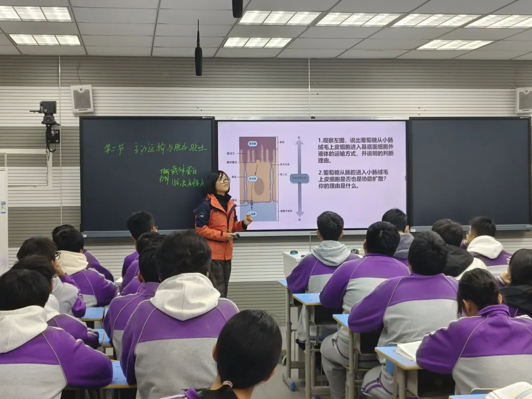 舒婷老師授課的主題是《主動運輸和胞吞胞吐》。舒老師通過播放一段“我國首次揭示葡萄糖轉(zhuǎn)運蛋白結(jié)構(gòu)”的視頻,激發(fā)學(xué)生學(xué)習(xí)興趣,導(dǎo)入新課。接著通過展示葡萄糖的運輸示意圖并提問,引導(dǎo)學(xué)生分析觀察圖片,思考并回答問題,歸納總結(jié)主動運輸和被動運輸?shù)膮^(qū)別。同時通過展示大量資料,讓學(xué)生總結(jié)并理解細(xì)胞膜結(jié)構(gòu)是運輸功能的基礎(chǔ)。最后通過題目讓學(xué)生再次回憶本節(jié)課學(xué)習(xí)的跨膜運輸方式及其特點。