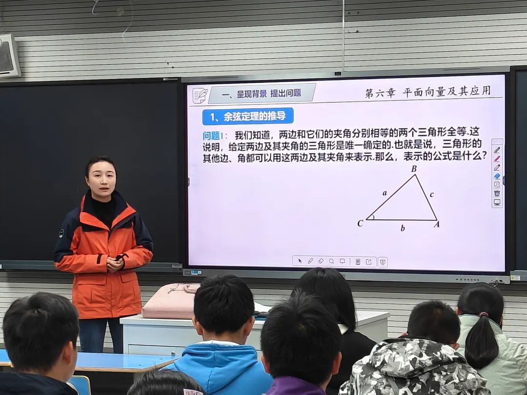 易婷老師的展示課題是《余弦定理》。這部分內(nèi)容學(xué)生在初中時(shí)已有了解,所以易婷首先請(qǐng)學(xué)生回憶了初中有關(guān)三角形的知識(shí),呈現(xiàn)產(chǎn)生問題的背景,引導(dǎo)學(xué)生將初中定性研究三角形的邊角關(guān)系,上升到能否研究它們的數(shù)量關(guān)系?導(dǎo)入自然流暢,符合學(xué)生的認(rèn)知特點(diǎn),加強(qiáng)新舊知識(shí)間的聯(lián)系。