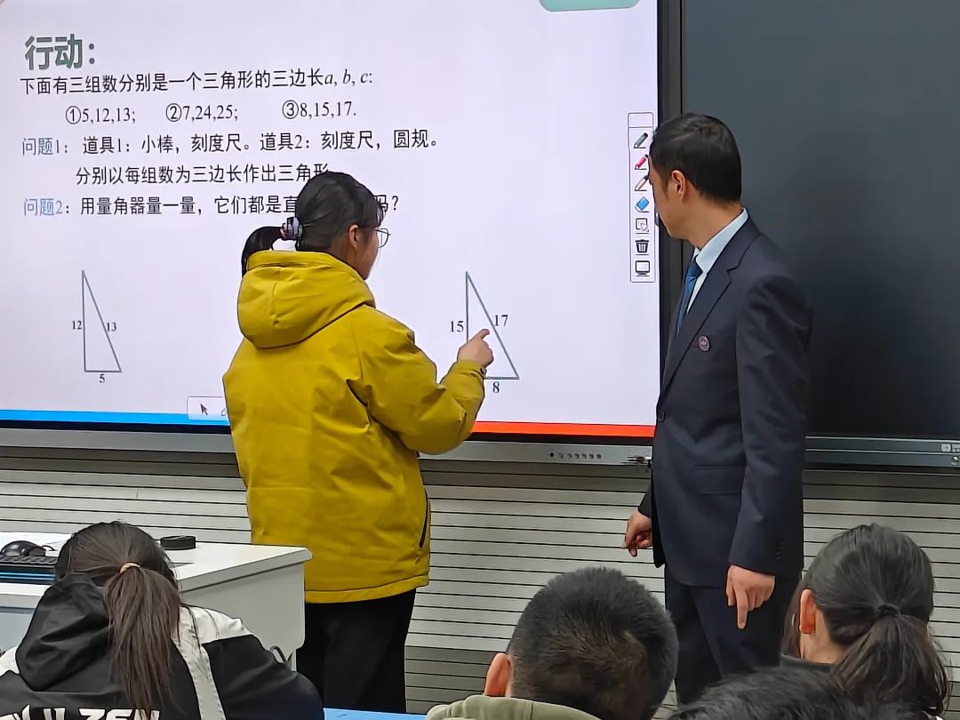 阮翰老師的展示課題是《勾股定理的逆定理》,阮老師通過引導(dǎo)學(xué)生對(duì)前面所學(xué)知識(shí)進(jìn)行歸納總結(jié),聯(lián)想到用三邊的關(guān)系是否可以判斷一個(gè)三角形為直角三角形,自然合理地提出問題。