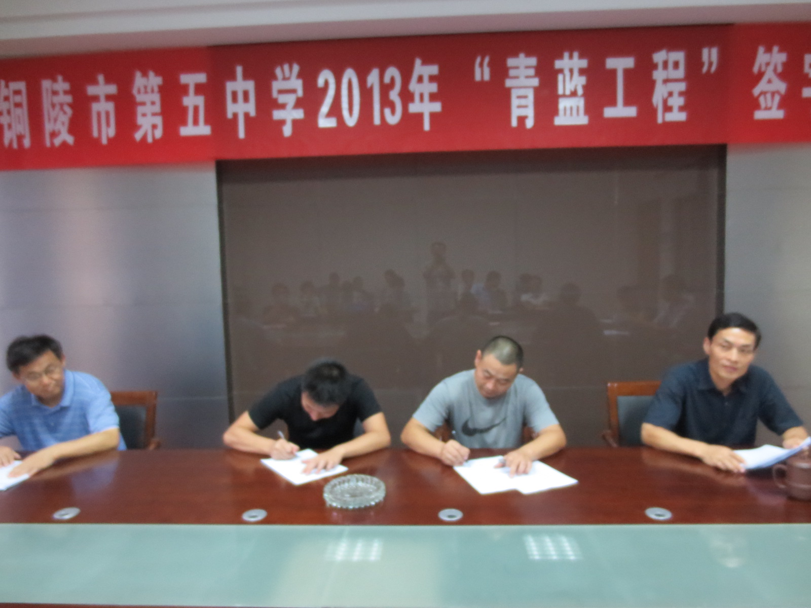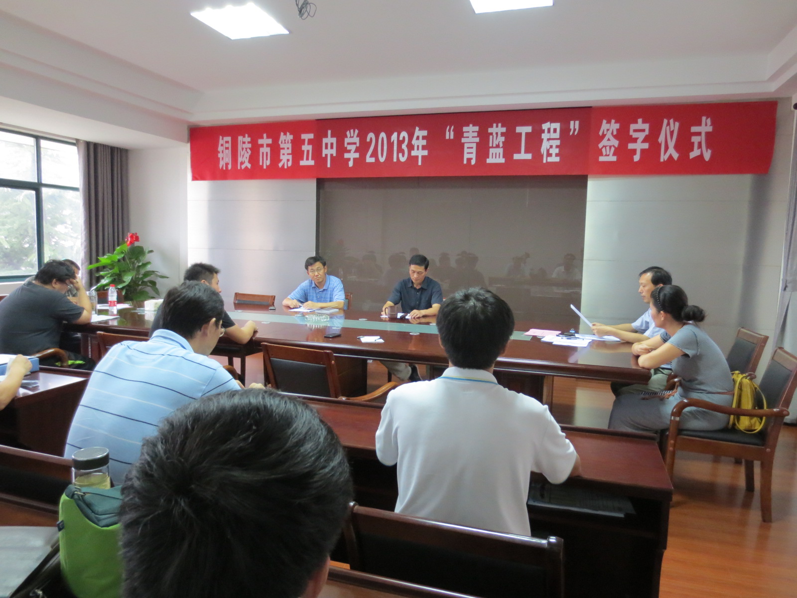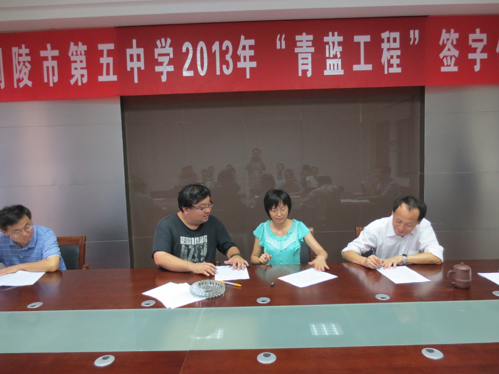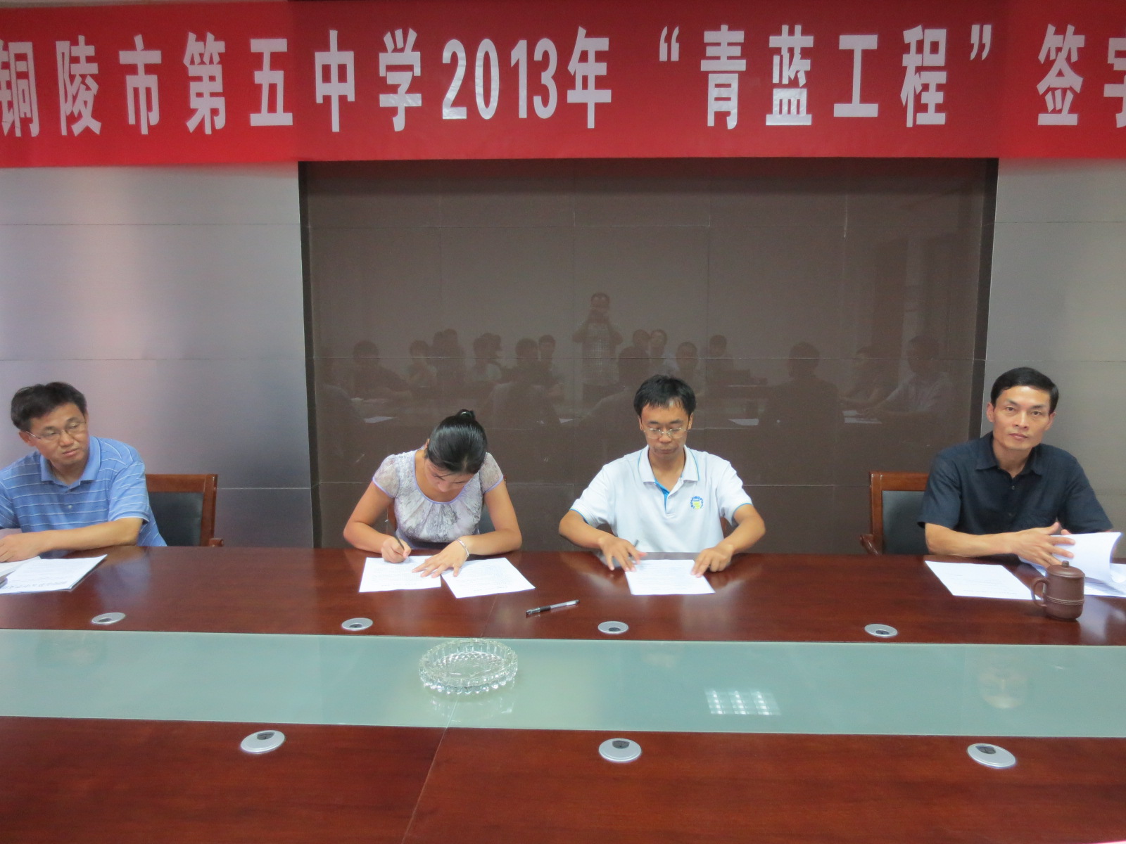 9月23日下午,學校2013年“青藍工程”師徒結對簽字儀式在行政樓會議室舉行�;顒佑蓷顣浿鞒�,6名新教師(班主任)、8名指導教師(班主任)、政教處負責人、教務處負責人和沐校長參加了簽字儀式。