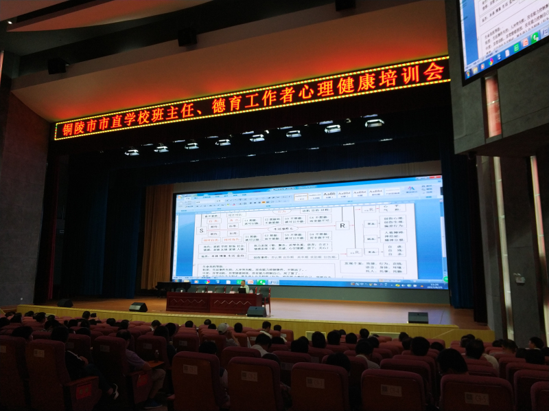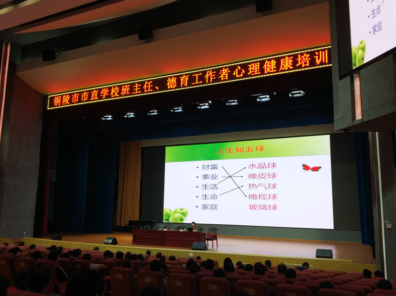 為切實(shí)加強(qiáng)全市中小學(xué)班主任暨德育工作隊(duì)伍建設(shè),有效提升德育工作者隊(duì)伍心理健康教育工作水平,8月25日,銅陵市市直學(xué)校班主任、德育工作者心理健康培訓(xùn)在市一中西湖小區(qū)報(bào)告廳舉行,我校黨支部副書(shū)記楊克貴、團(tuán)委書(shū)記周仁林、政教處主任薛乾乾和保衛(wèi)科負(fù)責(zé)人程永生及全體班主任參加此次培訓(xùn)。