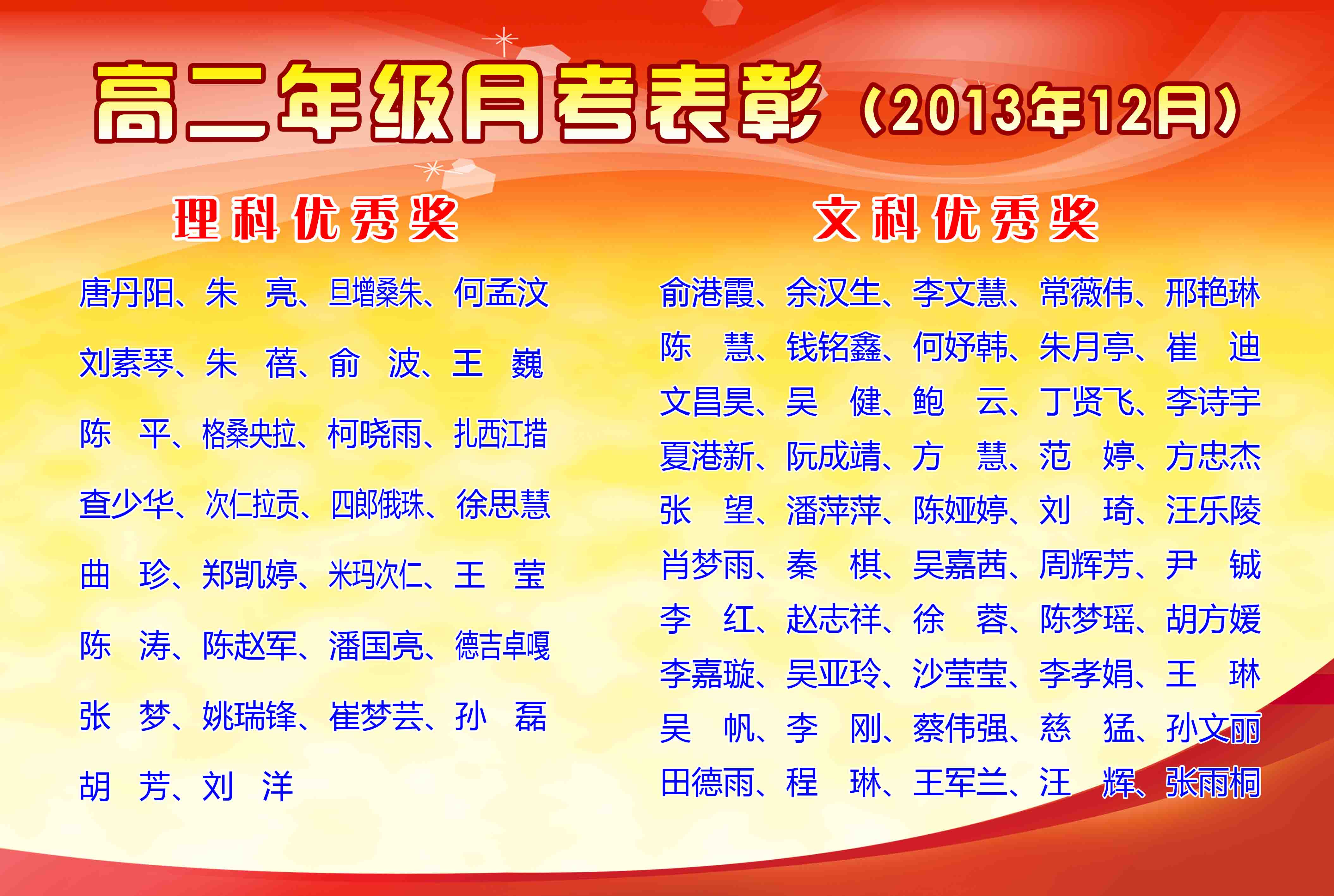 高二年級(jí)12月份月考于19-20日舉行,現(xiàn)將在本次月考中成績(jī)突出、榮獲優(yōu)秀獎(jiǎng)的同學(xué)表彰如下: