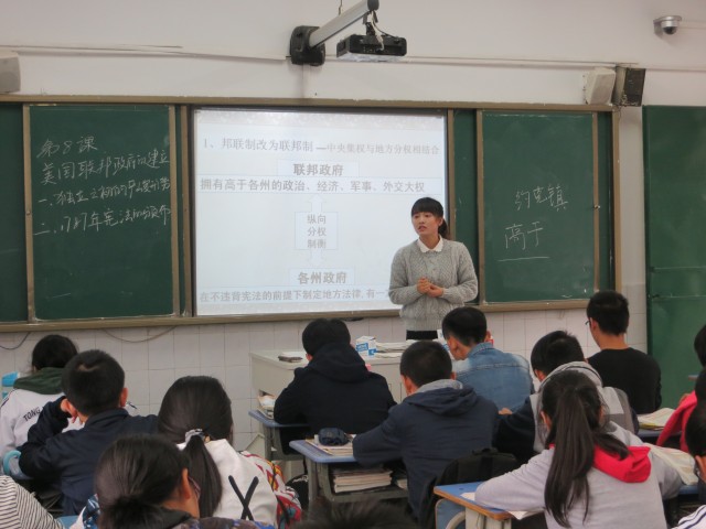 王文慧老師以《美國(guó)聯(lián)邦政府的建立》為課題,設(shè)計(jì)了“獨(dú)立之初的嚴(yán)峻形勢(shì)”、“1787年憲法的頒布”、“兩黨制的形成和發(fā)展”等教學(xué)內(nèi)容,整節(jié)課教學(xué)設(shè)計(jì)完整,教學(xué)過(guò)程流暢,學(xué)生參與度高,師生互動(dòng)好,展現(xiàn)了新教師良好的素質(zhì)和形象。