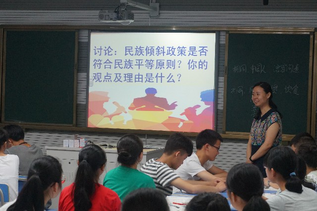 上午第二節(jié)課,蔣靈慧老師進(jìn)行了一堂《處理民族關(guān)系的原則:平等、團(tuán)結(jié)、共同繁榮》的新授課教學(xué)。蔣老師充分利用我校援藏教育的資源優(yōu)勢(shì),巧妙設(shè)計(jì)五則“曲珍的日記”,貫穿整個(gè)課堂,一例到底,步步為營(yíng),設(shè)計(jì)精巧。把學(xué)校的漢藏情誼與國(guó)家的民族情感巧妙融合,取得了很好的教學(xué)效果。