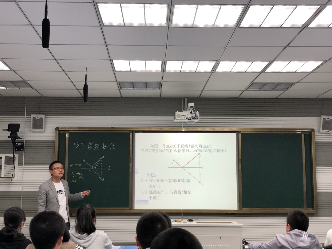 袁君老師的課題為《13.4最短路徑》,從學(xué)生身邊的實例、數(shù)學(xué)史中的小故事、《河邊飲馬》等等例子引入課題,激發(fā)了學(xué)生的學(xué)習(xí)興趣。教學(xué)中,袁老師語言親和,循循善誘,充分調(diào)動學(xué)生,通過提問、板演等方式與學(xué)生互動,取得了良好的教學(xué)效果。