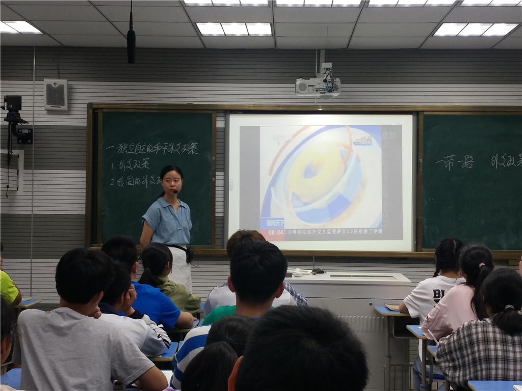 上午第二節(jié)課,政治組蔣靈慧老師進(jìn)行了《我國(guó)外交政策的基本目標(biāo)和宗旨》的新授課教學(xué)。蔣老師以“一帶一路”高峰論壇和中美貿(mào)易摩擦的時(shí)政熱點(diǎn)材料創(chuàng)設(shè)情景組織教學(xué),課堂上師生活動(dòng)豐富,教學(xué)目標(biāo)有效達(dá)成。