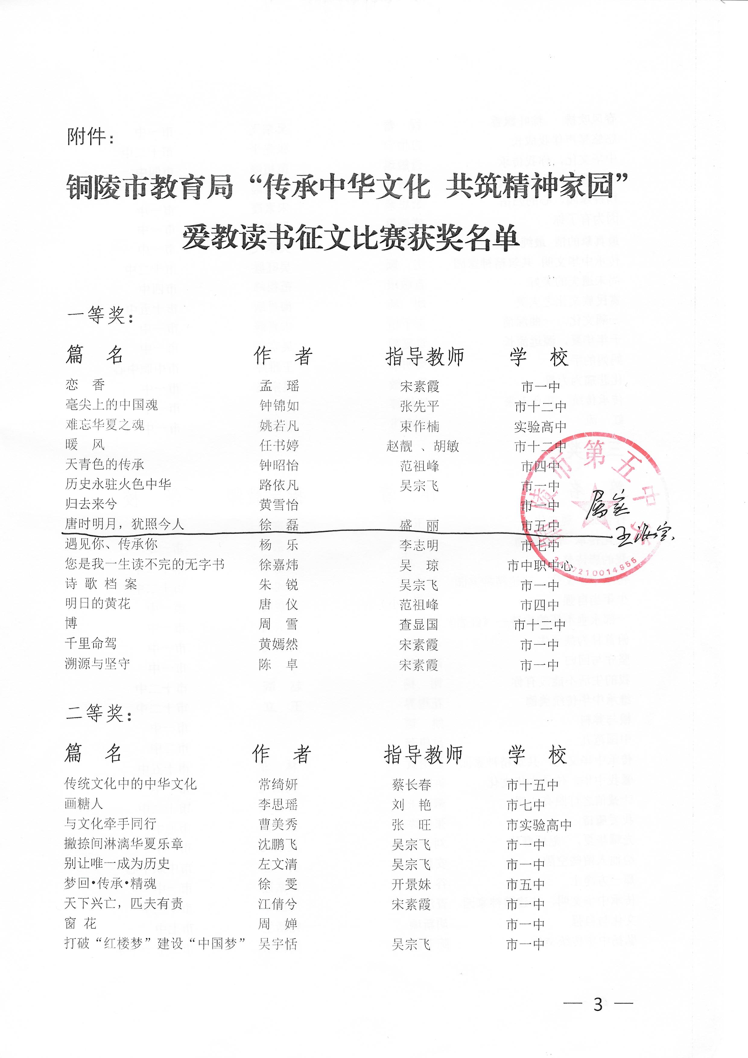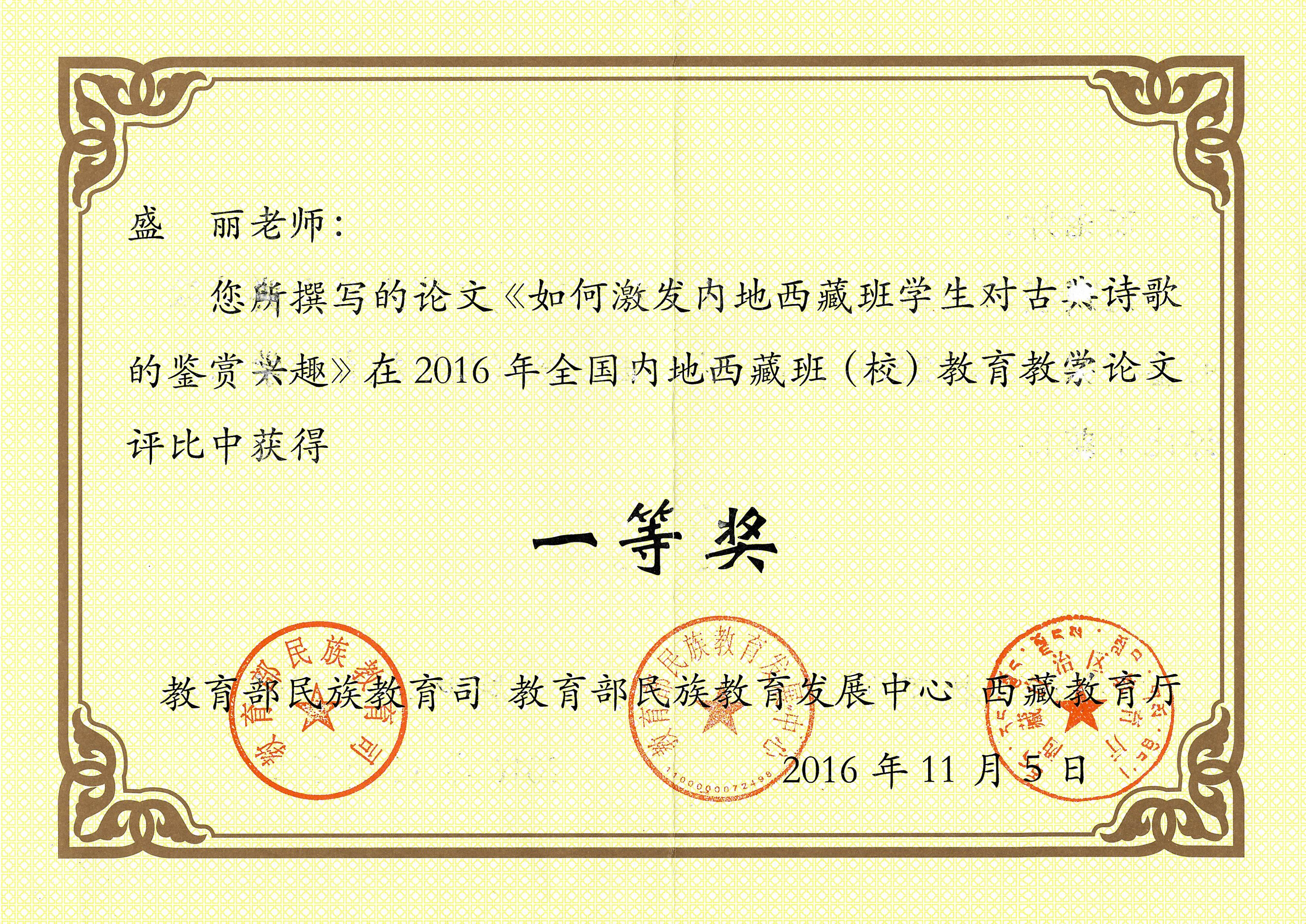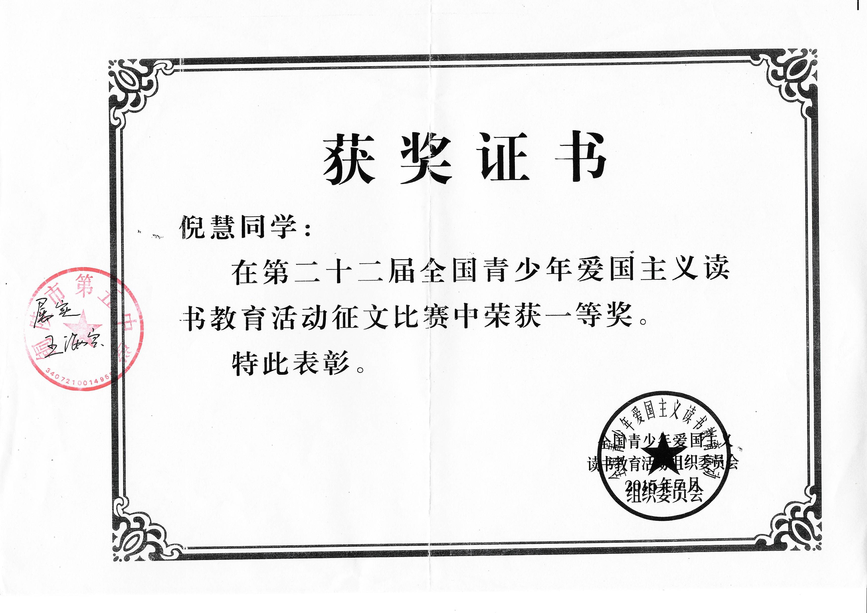 2015年,她輔導(dǎo)的倪慧同學(xué)榮獲了全國(guó)中學(xué)生愛國(guó)主義讀書征文活動(dòng)全國(guó)一等獎(jiǎng);2016年,她指導(dǎo)徐磊同學(xué)榮獲銅陵市愛教讀書征文比賽一等獎(jiǎng),并獲“優(yōu)秀輔導(dǎo)教師”稱號(hào);2019年她指導(dǎo)的次旺拉宗同學(xué)在現(xiàn)場(chǎng)直播的全國(guó)中學(xué)生愛國(guó)主義教育演講比賽中,榮獲全國(guó)一等獎(jiǎng)。盛麗老師作為優(yōu)秀指導(dǎo)教師代表安徽省在北京電視臺(tái)接受表彰。