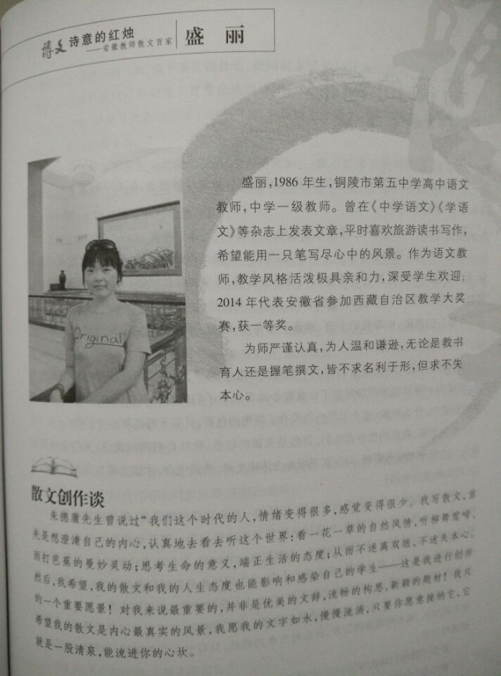 盛麗平時(shí)大量閱讀教育教學(xué)理論書籍和文學(xué)作品,積極寫作,作品經(jīng)常見諸各類報(bào)刊。散文作品被《詩(shī)意的紅燭--安徽教師散文百家》錄用并出版,撰寫的論文《如何激發(fā)內(nèi)地西藏班學(xué)生對(duì)古典詩(shī)歌的鑒賞興趣》榮獲全國(guó)一等獎(jiǎng)。