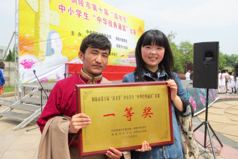 2017年,學(xué)校組織十多位西藏班學(xué)生參加銅陵市第十屆“讀書節(jié)”中小學(xué)生“中華經(jīng)典誦讀”比賽,她主動(dòng)給予指導(dǎo)。賽前,盛麗從音標(biāo)教起,傳授口部操,逐字逐句一遍遍示范,反復(fù)糾正每個(gè)人的讀音聲調(diào)和節(jié)奏,設(shè)計(jì)藏語(yǔ)朗誦古詩(shī)的環(huán)節(jié)……常常忙到夜晚都無暇休息片刻。從組隊(duì)形到上臺(tái)走位,她不辭辛勞,全程參與。功夫不負(fù)有心人,節(jié)目榮獲市級(jí)一等獎(jiǎng),收獲現(xiàn)場(chǎng)廣大市民的一致好評(píng)。