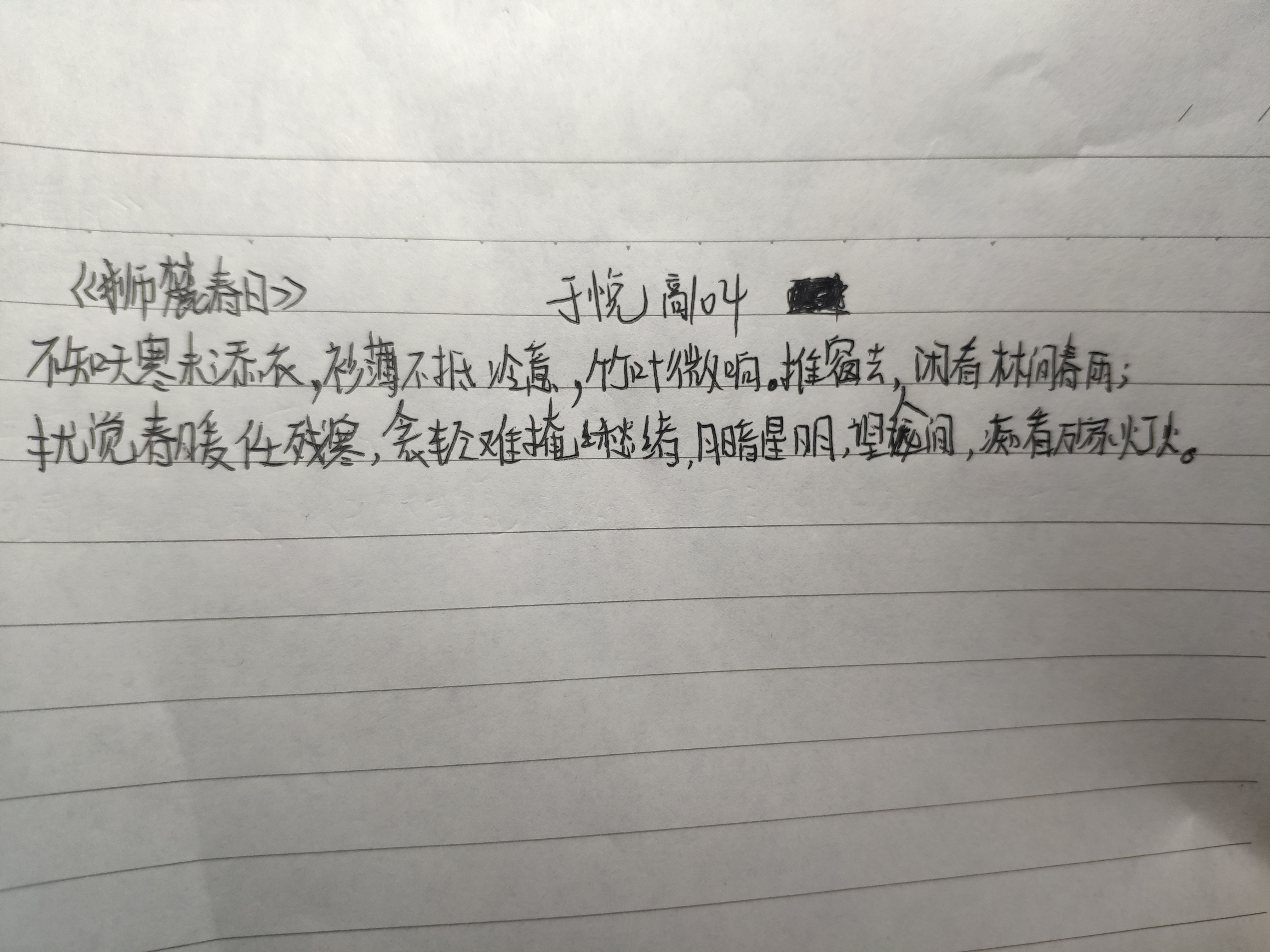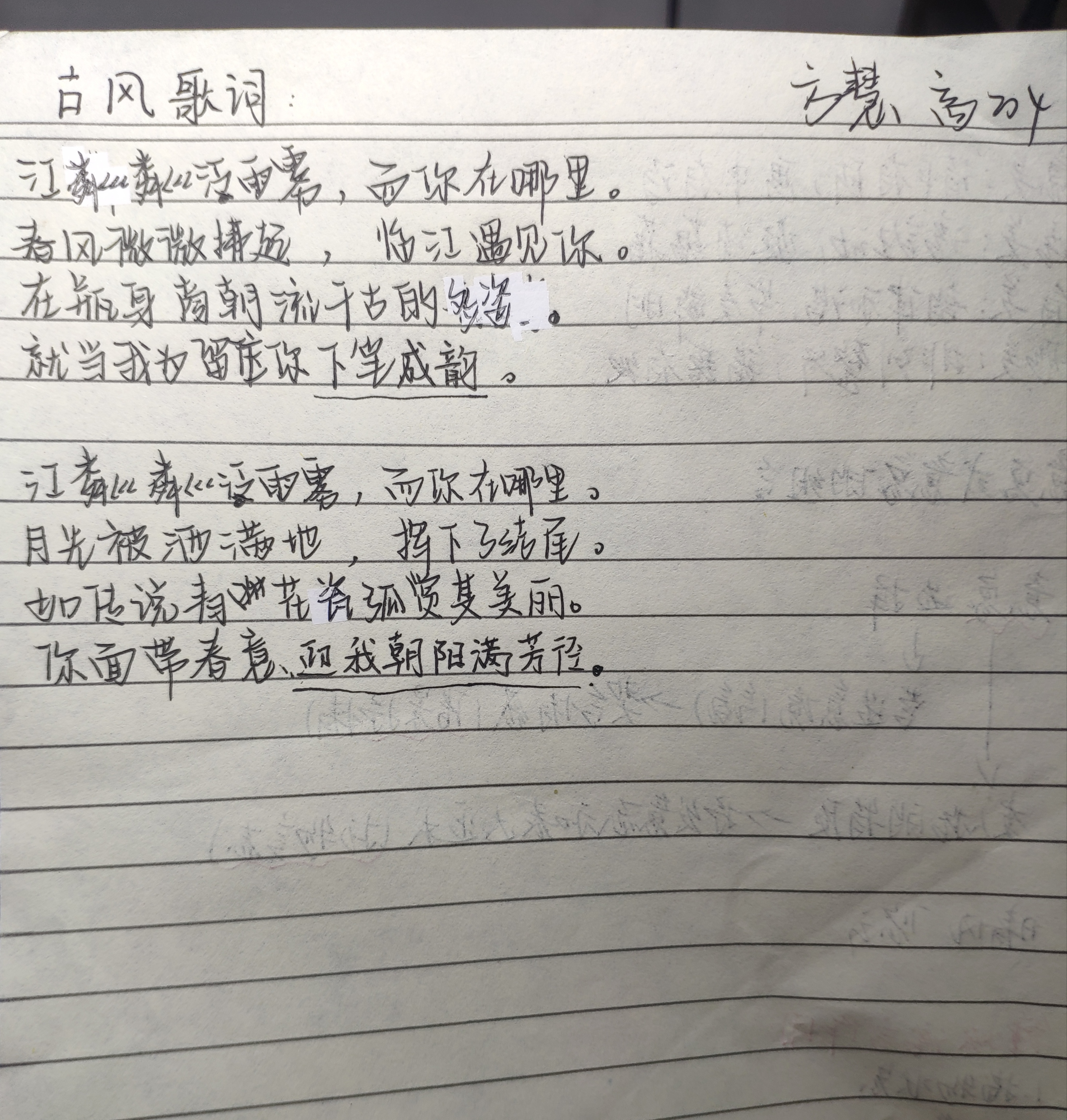 課程最后,盛老師與大家分享了自己的古風(fēng)作品以及創(chuàng)作體會。同學(xué)們受到鼓舞,聽著古風(fēng)曲子拿起筆,各自即興創(chuàng)作了一篇古風(fēng)歌詞。學(xué)生們的作品各有特色,富有意趣。