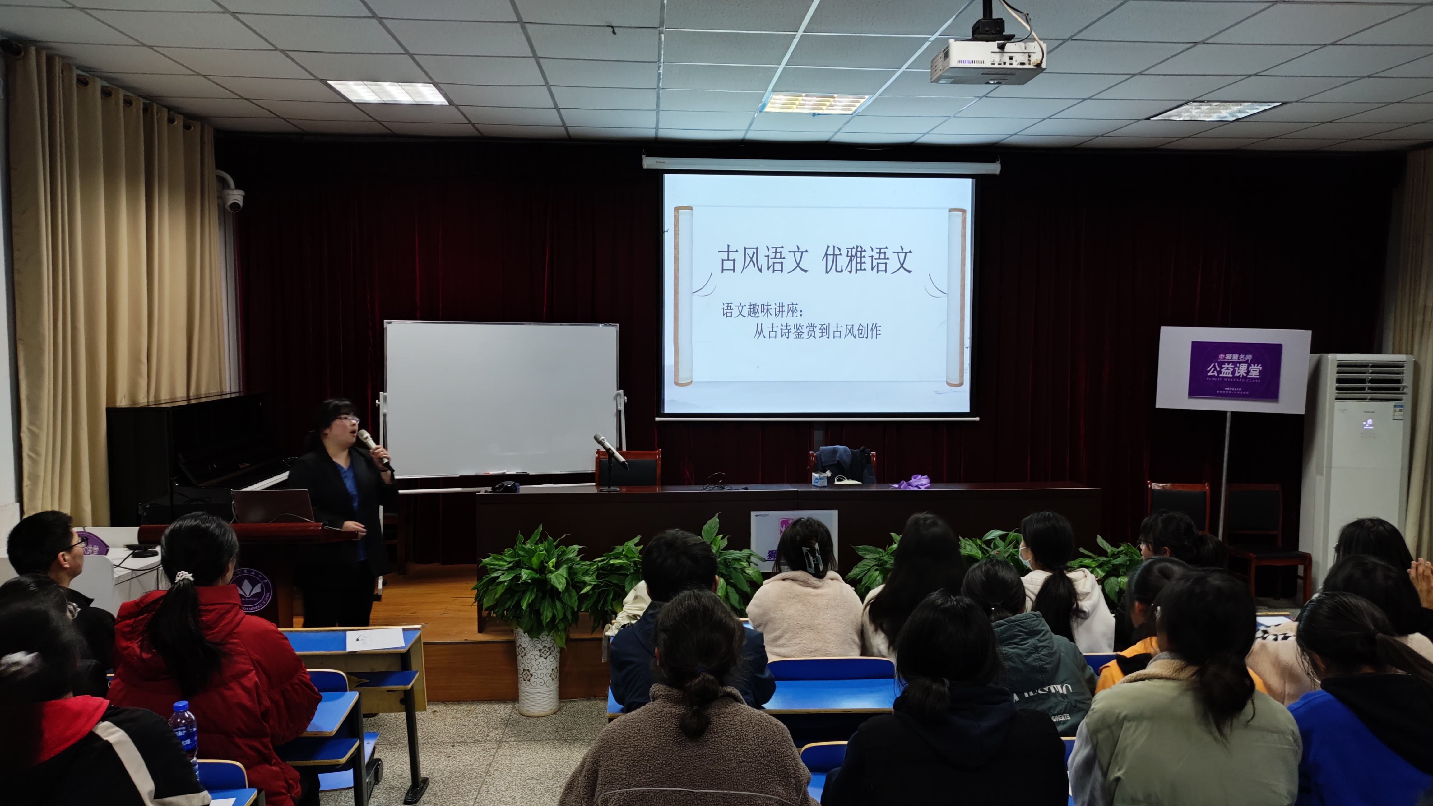 名師引領(lǐng),揚(yáng)帆起航。3月25日晚18:30分,銅五·獅麓名師公益課堂首講準(zhǔn)時(shí)在學(xué)校多功能室進(jìn)行。多功能室內(nèi)座無虛席,來自校內(nèi)外的師生近200余人傾聽了盛麗老師以《古風(fēng)語文,優(yōu)雅語文》為課題的精彩課程。