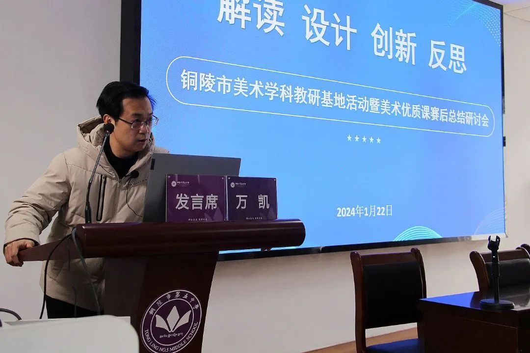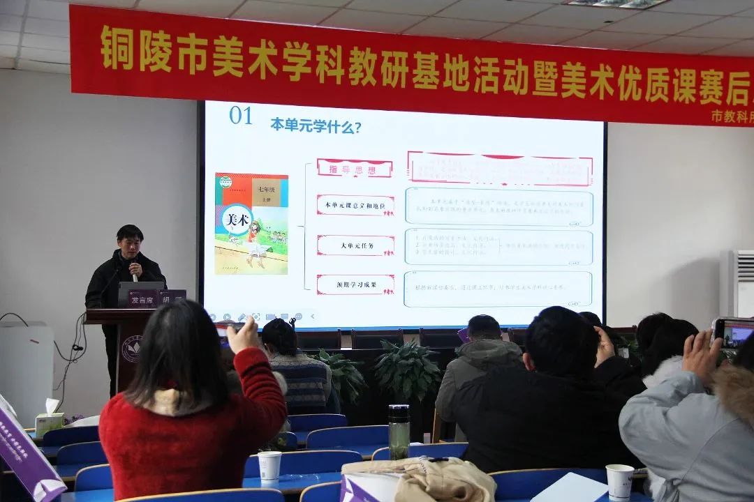 為進一步提升廣大美術教師的教學水平,達到以賽促教、以賽促學、以賽促改、以賽促建,更好地建設高素質專業(yè)化創(chuàng)新型教師隊伍的目的,2024年1月22日上午,銅陵市美術學科教科研基地活動暨美術優(yōu)質課賽后總結研討會在銅陵市第五中學多功能室舉行。