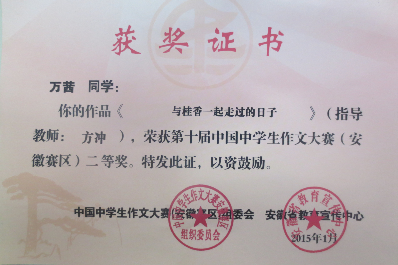 前不久,第十屆中國(guó)中學(xué)生作文大賽(安徽賽區(qū))評(píng)選結(jié)果揭曉,我校初302班萬(wàn)茜同學(xué)的作文《與桂香一起走過(guò)的日子》榮獲二等獎(jiǎng)。(指導(dǎo)教師:方?jīng)_)