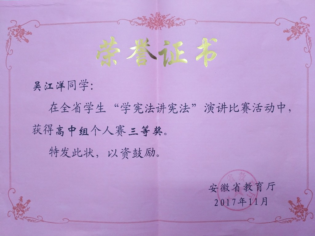 我校吳江洋同學(xué)在2017年中小學(xué)生“學(xué)憲法講憲法”演講比賽中獲得高中組個人賽省級三等獎。(指導(dǎo)老師:張勝利)