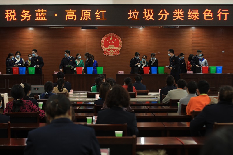 活動(dòng)伊始,稅務(wù)志愿者通過“PPT”向大家深入淺出地講解了垃圾分類的意義、方法以及稅收政策對(duì)環(huán)保的助力。在隨后的垃圾分類趣味比賽中,西藏班學(xué)生和稅務(wù)志愿者被分成八組,每組有1名稅務(wù)志愿者和2名西藏班學(xué)生組成。隨著主持人的一聲令下,大家迅速將手中的108張生活垃圾卡片投放到可回收物、廚余垃圾、有害垃圾和其他垃圾四個(gè)道具垃圾箱中。比賽間隙,主持人還與大家進(jìn)行了互動(dòng)知識(shí)問答。經(jīng)過緊張激烈的比賽,西藏班學(xué)生益西卓瑪所在的第七小組以95.5%的投放正確率獲得冠軍,參賽的8個(gè)小組投放正確率都達(dá)到了85%以上。