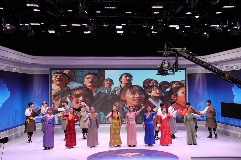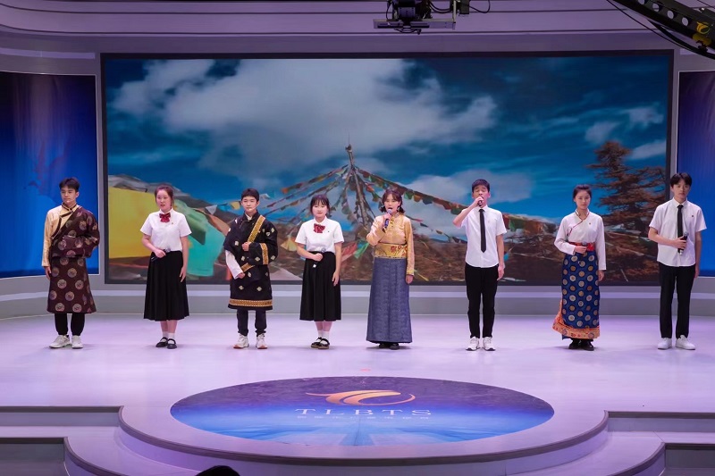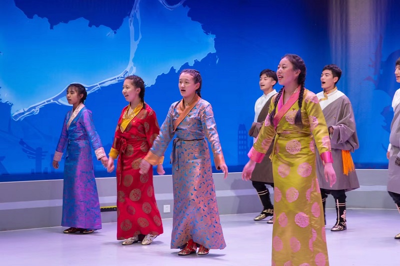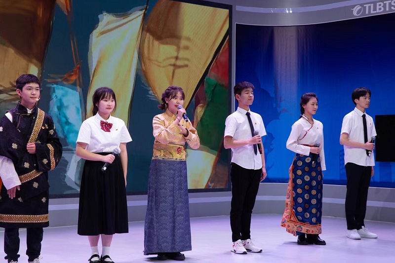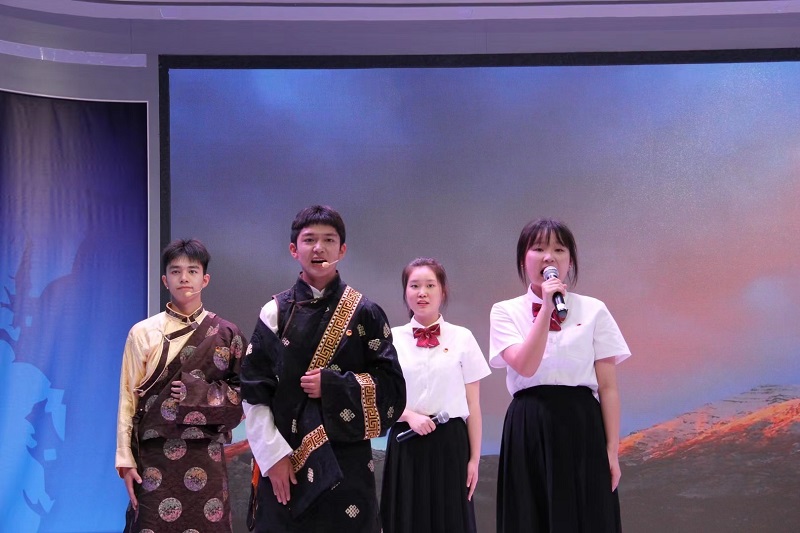 一曲《再唱山歌給黨聽》拉開朗誦的序幕,身著鮮艷藏裝的藏族學(xué)生如青春絢麗的花朵,飽含對(duì)黨、對(duì)祖國的感恩之情,唱出心聲。“五十六個(gè)民族再唱山歌給黨聽喲!我們漢藏是一家!”