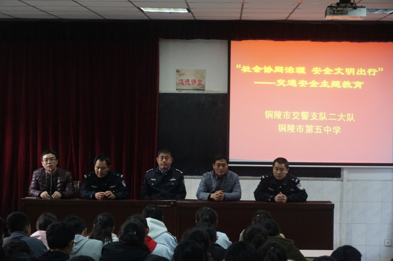 為貫徹執(zhí)行《中華人民共和國道路交通安全法》,營造安全、文明的校園周邊交通環(huán)境,培養(yǎng)學(xué)生良好的交通安全意識,12月2日,我校舉辦以“社會協(xié)同治理、安全文明出行”為主題的交通安全知識講座,我校黨支部副書記楊克貴、銅陵市交警支隊(duì)二大隊(duì)教導(dǎo)員王龍、副支隊(duì)長韓接民、丁偉參加此次講座,主講人是副支隊(duì)長韓接民。