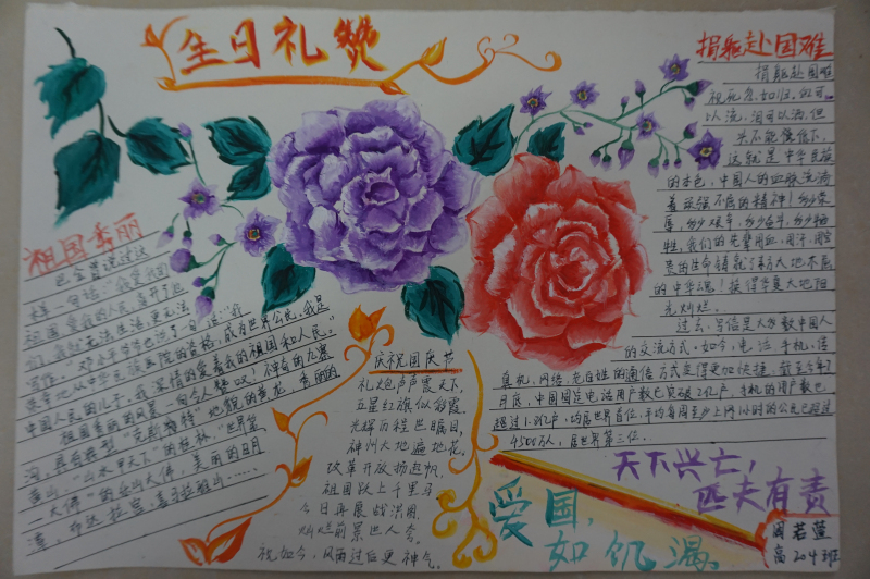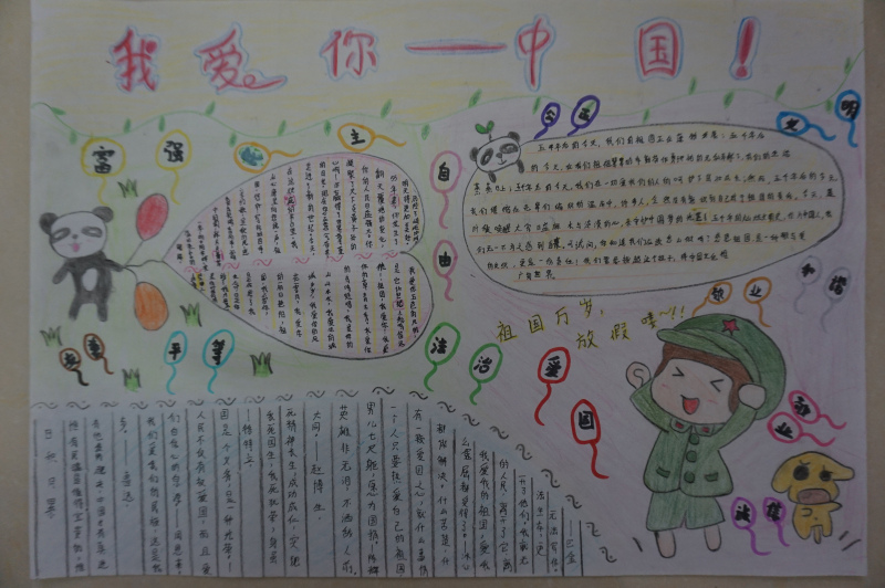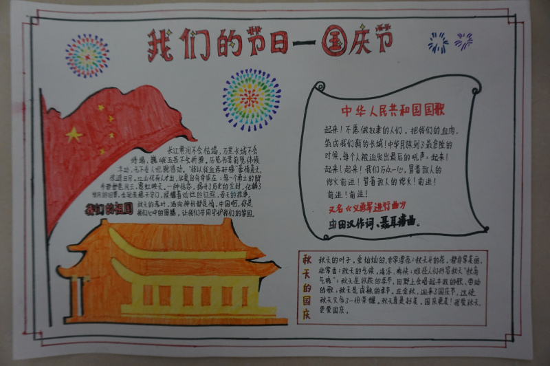 本次活動得到了各班級的積極響應(yīng),班主任認真輔導(dǎo),學(xué)生精心制作,充分發(fā)揮自己的聰明才智,收集各種資料、圖片,設(shè)計版面、編輯內(nèi)容,創(chuàng)作了一幅副主題鮮明、活潑新穎、圖文并茂的精美手抄報。無論是從整體的排版設(shè)計,還是從細微的邊框設(shè)計,無不給人美的享受。一幅幅精美的手抄報,不僅是向祖國母親67歲生日敬獻一份華誕賀禮,表達了廣大學(xué)生對祖國母親的熱愛,也使學(xué)生們更加了解祖國的成立與發(fā)展,同時也拓寬了學(xué)生的藝術(shù)視野,提高了學(xué)生的藝術(shù)視野和審美能力。