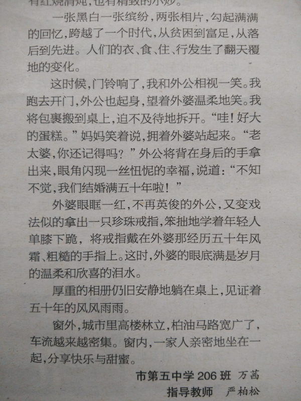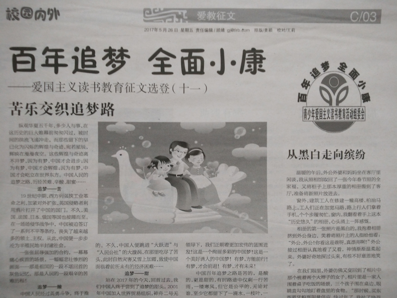 年5月26日,《銅都晨刊》在C/03版面刊登我校高206班萬(wàn)茜同學(xué)的文章《從黑白走向繽紛》(指導(dǎo)教師:嚴(yán)柏松)。據(jù)悉,《銅都晨刊》不定期安排版面選登全市“百年追夢(mèng) 全面小康”愛國(guó)主義讀書教育活動(dòng)中的優(yōu)秀征文。