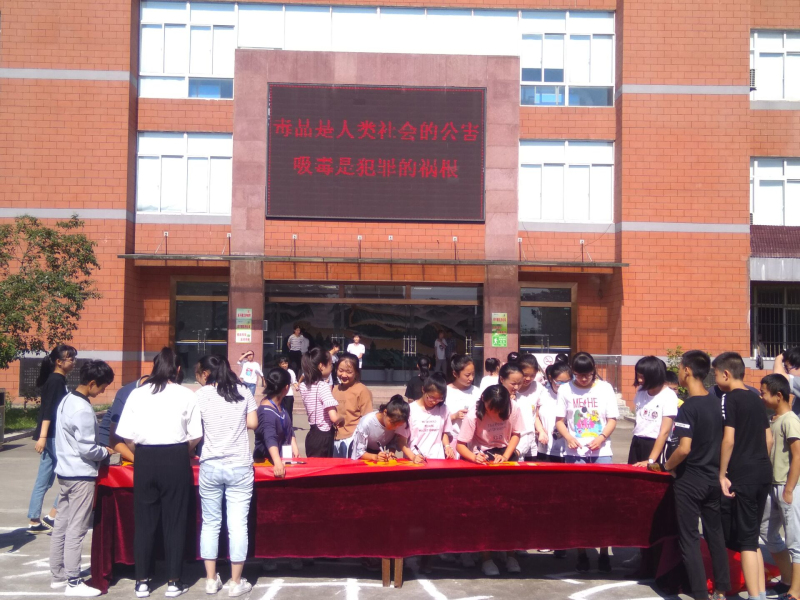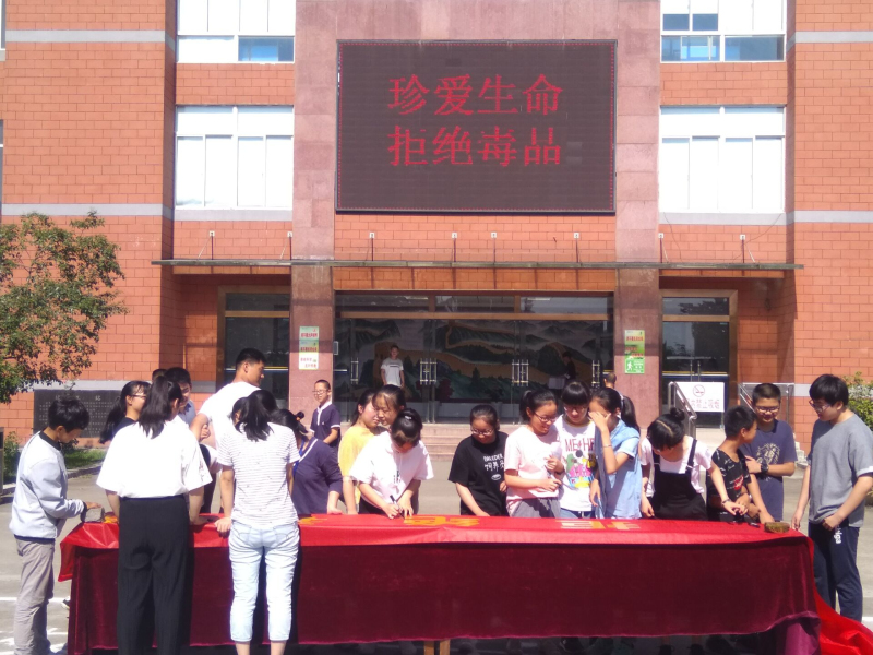 各班級召開主題班會,班主任帶領(lǐng)學生學習《中國人民共和國禁毒法》展示毒品的侵害,宣傳毒品濫用的基本常識和危害,分析中學生染毒的緣由,交給學生如何防范毒品的技能,引導學生做一個知法守法的正義人;政教處在校園的醒目位置張貼禁毒宣傳畫,利用學校的電子顯示屏滾動播放禁毒宣傳口號,利用手機短信、微信等新型媒體播放禁毒公益廣告、宣傳警示語等,還安排學生會干部在逸夫樓廣場組織廣大師生開展“珍愛生命、拒絕毒品”的簽字活動。