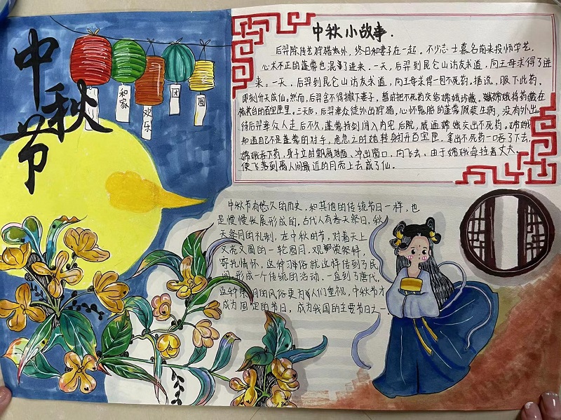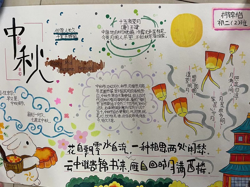 本次活動(dòng),同學(xué)們參與熱情高漲,廣泛收集有關(guān)中秋佳節(jié)的資料,精心設(shè)計(jì)手抄報(bào)版面,把自己對(duì)傳統(tǒng)節(jié)日——“中秋”的理解以及對(duì)祖國(guó)和家人的祝福都寄托其中,制作的手抄報(bào)主題突出,內(nèi)容豐富,圖文并茂。