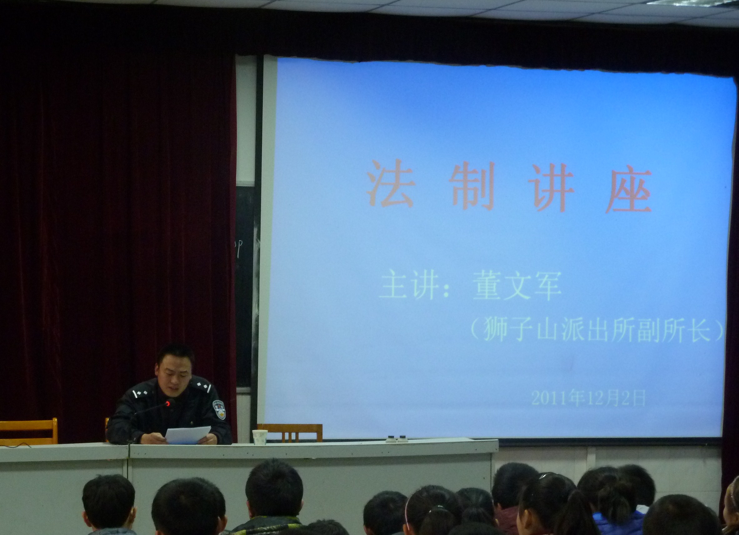董所長的講座從遵守學(xué)校的規(guī)章制度、預(yù)防未成年犯罪、學(xué)生安全防范等方面進行了強調(diào)。董所長列舉了一些本地區(qū)的青少年違法犯罪事例,并針對校園內(nèi)一些常見的違法事件對學(xué)生進行了分析和說明,教育學(xué)生要鞏固思想堡壘,提高防范意識,增強自我約束,最為重要的是要加強法制觀念,克服愚昧無知的思想行為。董所長以自己豐富的法律知識,憑自己多年的法律實踐,結(jié)合中學(xué)生年齡、心理特點,給同學(xué)上了一堂生動精彩的法制課。
