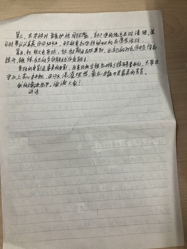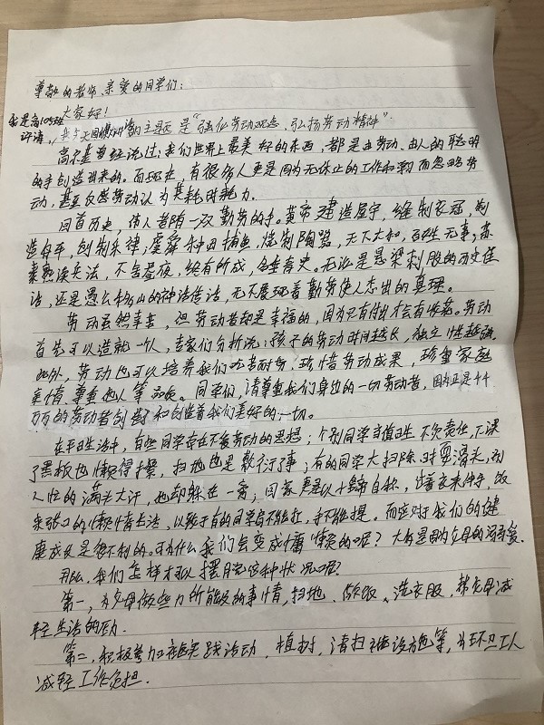 為構(gòu)建德智體美勞全面培養(yǎng)的教育體系,進(jìn)一步培育和踐行社會(huì)主義核心價(jià)值觀,積極培養(yǎng)學(xué)生愛(ài)勞動(dòng)的意識(shí)和良好的勞動(dòng)習(xí)慣,我校開展中學(xué)生勞動(dòng)教育宣傳周活動(dòng)。今天上午,國(guó)旗下講話,由高105班許濤同學(xué)分享五一假期的勞動(dòng)實(shí)踐的心得分享。通過(guò)這次勞動(dòng)實(shí)踐,不但鍛煉了自理能力,也培養(yǎng)了自己獨(dú)立的性格。