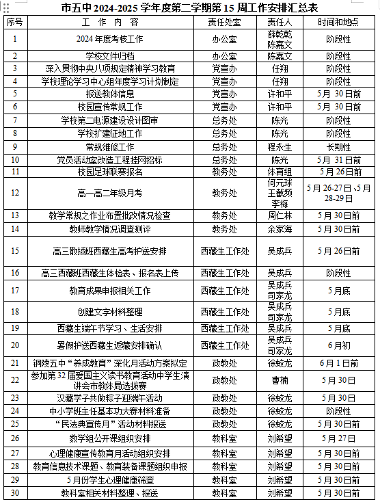 市五中2024-2025學年度第二學期第15周工作安排匯總表