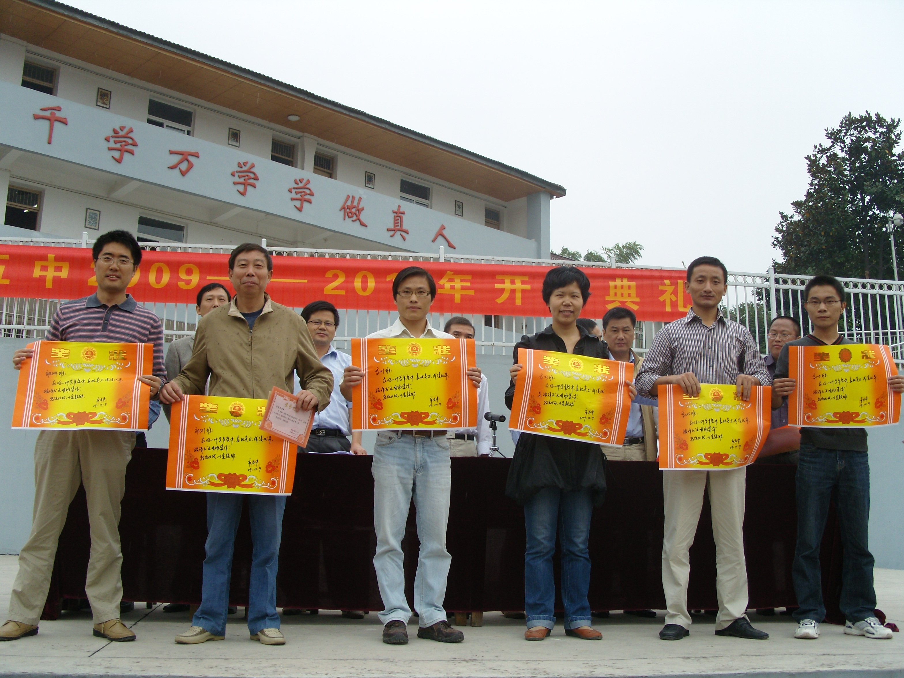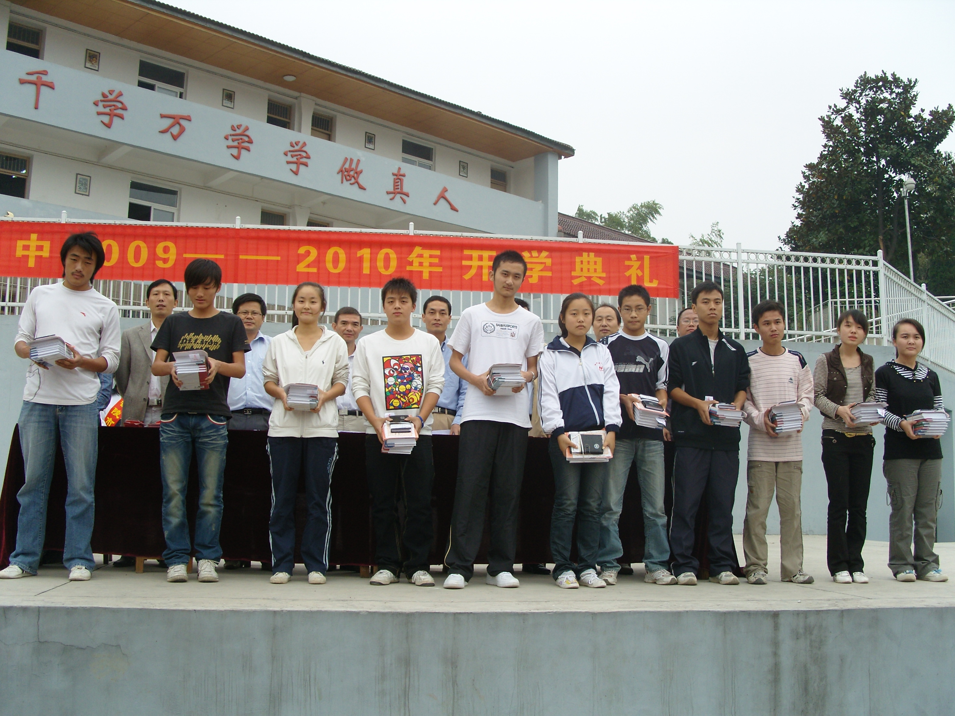2009年10月9日,我校在塑膠操場隆重舉行2009—2010學年度開學典禮。通報了過去的一學年我校取得的成績。高中考成績優(yōu)異,在高考中,我校有60余名同學達本科分數(shù)線,200余名同學達�?品謹�(shù)線,在同類學校中位居前列;中考有35名同學達省級示范高中定向線,其中19名同學被市一中錄��;師生在各類比賽中捷報頻傳。教師66人次分獲國家、省、市一二三等獎,國家級獎3人次,其中省級獎25人次。學生78人次獲市級以上獎,其中省級獎15人次。學校先后被評為省“未成年人思想道德建設示范�!薄⑹ 熬G色學�!�、省“教育系統(tǒng)先進單位”、市“明星學校”。 表彰了校先進班集體、優(yōu)干、三好生、單項獎及校長獎學金獲得者并舉行頒獎典禮。