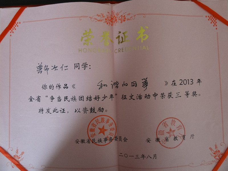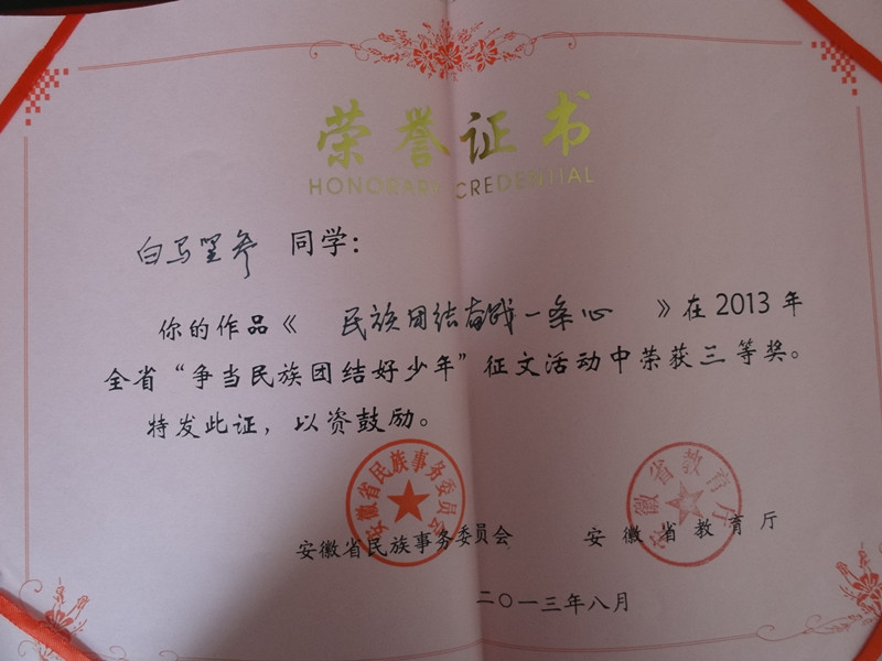 據(jù)悉,這次征文比賽自7月份文件發(fā)至各地市民委、教育局后,得到全省各民族小學(xué)、全省各地初級(jí)中學(xué)、內(nèi)地新疆班、內(nèi)地西藏班的大力支持,學(xué)生更是積極投稿參賽。經(jīng)省民委、省教育廳聘請(qǐng)的在肥高校老師的認(rèn)真嚴(yán)格的評(píng)選,評(píng)委會(huì)選出10名一等獎(jiǎng)、20名二等獎(jiǎng),30名三等獎(jiǎng)。我校無論是獲獎(jiǎng)等次、還是獲獎(jiǎng)人數(shù)均是參賽眾多學(xué)校中成績(jī)最好。在8月30日舉辦的“安徽省暨合肥市民族團(tuán)結(jié)進(jìn)步宣傳月”啟動(dòng)儀式上,省委常委、省統(tǒng)戰(zhàn)部部長(zhǎng)沈素麗、安徽省副省長(zhǎng)方春明出席,省教育廳副廳長(zhǎng)金燕親自為我校獲獎(jiǎng)學(xué)生頒發(fā)證書,并鼓勵(lì)我校獲獎(jiǎng)學(xué)生努力學(xué)習(xí),再接再厲。