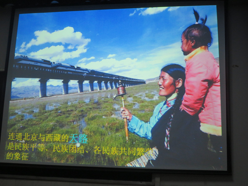 在高亢悠揚的韓紅的《天路》歌曲聲中,主講人蔣靈慧老師登上講壇。我國是個多民族的國家,偉大的祖國是各民族共同締造的,我國社會主義新型民族關(guān)系的建立,我國處理民族關(guān)系的基本原則,鞏固社會主義民族關(guān)系我們該做什么、能做什么,五個方面內(nèi)容環(huán)環(huán)相扣,層層深入。大量的圖片材料、新聞事實、視頻資料,知識講解、合作探究、師生互動,詳細的案例分析、可信的對比數(shù)據(jù)、生動的教學(xué)語言,讓參加活動的高一全體西藏生及高106班全體同學(xué)深受教育。
