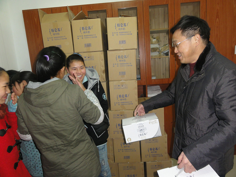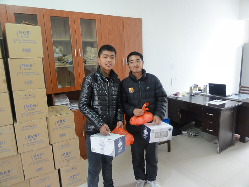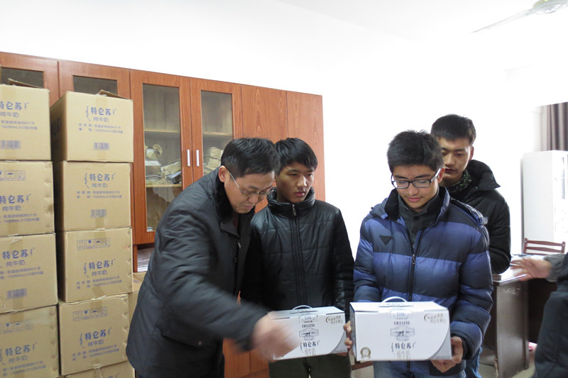 新年第一天,和風(fēng)徐拂,暖陽高照,我校綜合樓二樓西藏生工作處更是暖意融融,市工商銀行獅子山分行贈(zèng)送的和學(xué)校統(tǒng)一采購的新疆蘋果和蒙牛特侖蘇純牛奶正在一份一份地分發(fā)到西藏生的手里。沐揚(yáng)校長(zhǎng)、楊克貴書記、西藏生工作處三位老師放棄休息時(shí)間,西藏班同學(xué)陸續(xù)過來。送出的是愛心和祝福,接到的濃情和謝意。溫情真意洋溢,歡聲笑語飄蕩。