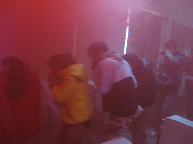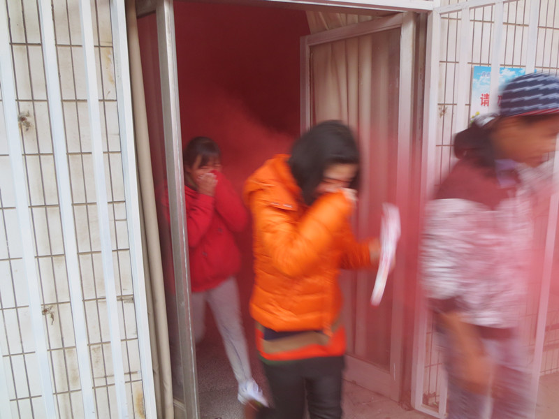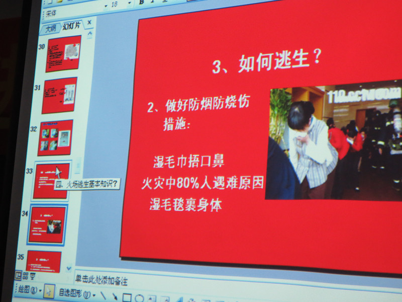 最后,在多媒體教室,同學(xué)們在消防五中隊?wèi)?zhàn)士的指導(dǎo)下進行火警逃生疏散演練。