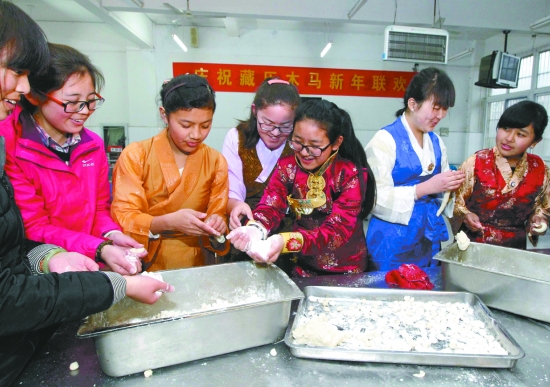 2月28日,市第五中學的藏族學生圍在一起做“古突”。當日是藏歷水蛇年十二月二十九,第五中學的老師和西藏班學生在校園里按照藏族習俗喜迎藏歷木馬新年。據(jù)了解,藏族人吃“古突”,和漢族人在除夕吃年夜飯一樣,都表達著人們對新一年的祝福和希望。