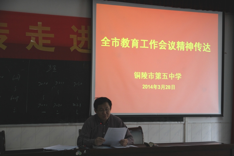 3月28日,我校召開全體教職工會,傳達全市教育工作會議精神,重點傳達了市教育局黨委書記、局長李勇同志的講話精神,同時將《銅陵市教育局2014年工作要點》、《開展“強師德、正師風(fēng)、樹形象”專項活動工作方案》、《銅陵市教育局關(guān)于加強中小學(xué)學(xué)科建設(shè)工作的意見》等精神在會上作了傳達。
