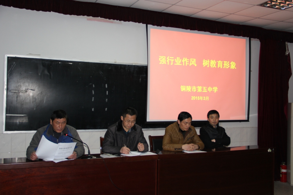 會(huì)上,孫曉東副校長首先帶領(lǐng)全體教職工認(rèn)真學(xué)習(xí)了《銅陵市教育局關(guān)于在全市教育系統(tǒng)開展“強(qiáng)行業(yè)作風(fēng),樹教育形象”教育實(shí)踐活動(dòng)的通知》文件精神,就“強(qiáng)行業(yè)作風(fēng),樹教育形象”教育實(shí)踐活動(dòng)的具體目標(biāo)、重點(diǎn)內(nèi)容和時(shí)間安排向全體教職工做了詳細(xì)的解讀。校黨支部書記、校長沐揚(yáng)同志結(jié)合市行風(fēng)評(píng)議結(jié)果對全市教育系統(tǒng)存在的影響教育行業(yè)形象的不正之風(fēng)進(jìn)行了深入的分析,就抵制有償家教、濫定濫發(fā)教輔資料、和教育亂收費(fèi)等方面的重點(diǎn)問題向教職工提出了明確要求,號(hào)召大家發(fā)揚(yáng)五中的優(yōu)良傳統(tǒng),共同為構(gòu)建和諧校園,樹五中教育形象而努力。