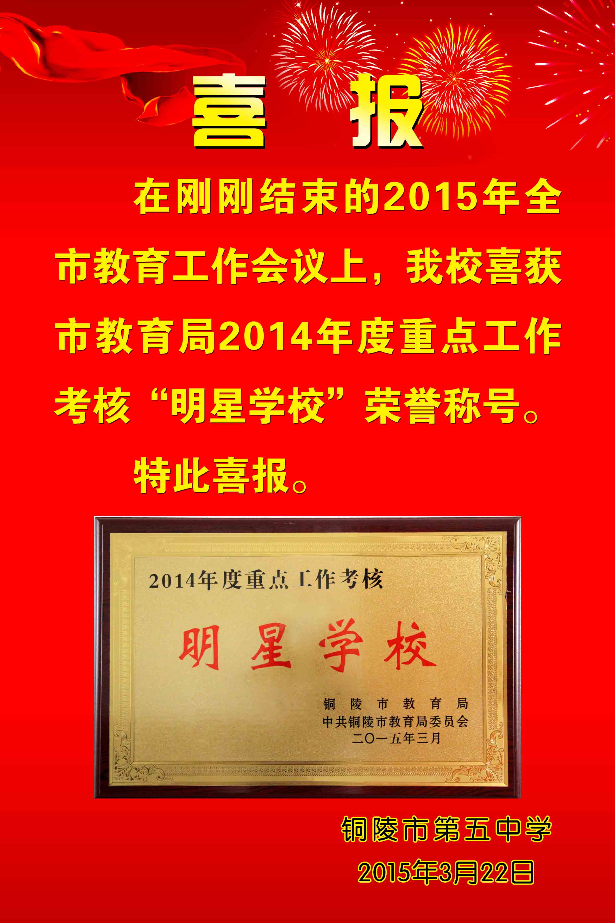 在剛剛結束的全市教育工作會議上,我校在2014年度學校重點工作考核中獲“明星學�!惫鈽s稱號,特此報喜,感謝大家的努力拼搏!