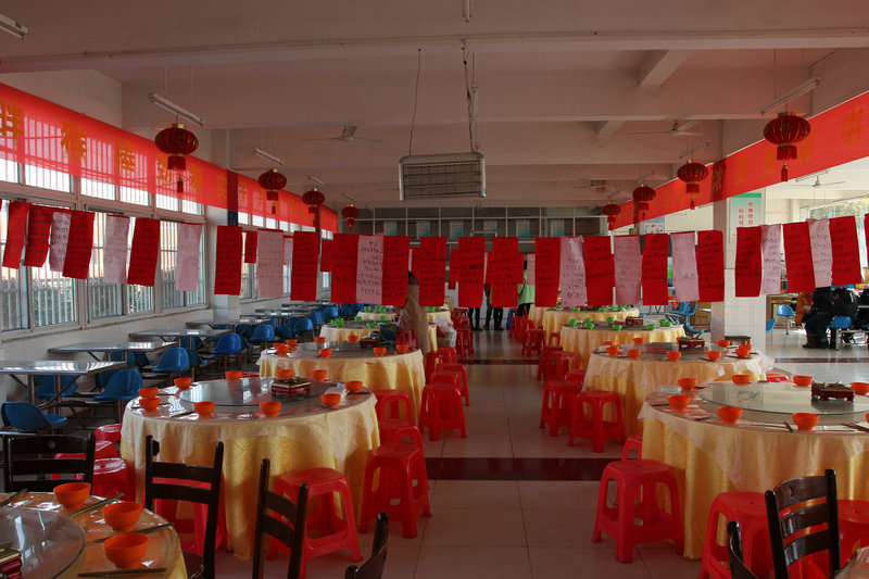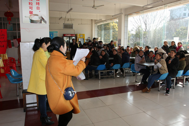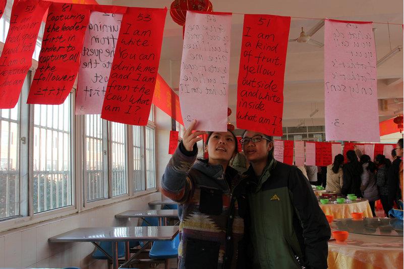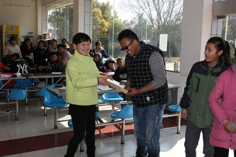 早上10:00,突然接到集中通知的藏班學生們剛聚集到學校食堂,就被眼前的景象驚呆了,食堂里掛上了寫滿節(jié)日祝福的條幅和喜慶的燈籠,天花板上掛滿了彩帶和紅紙,桌子上還堆滿了巧克力和一些精致的小玩具,整個食堂顯然是被用心布置過了,走進仔細一看,每張紅紙上都寫了一些英語單詞。正當大家疑惑不解、議論紛紛的時候,學校西藏生工作處主任吳成兵老師為大家揭開了謎底。原來學校五名英語教師早在放寒假前就策劃著,準備在除夕這天給藏班孩子們送上一份驚喜,陪他們度過一個有意義的、與眾不同的除夕,今天的“驚喜”就是師生一起開展英語趣味有獎游戲活動。