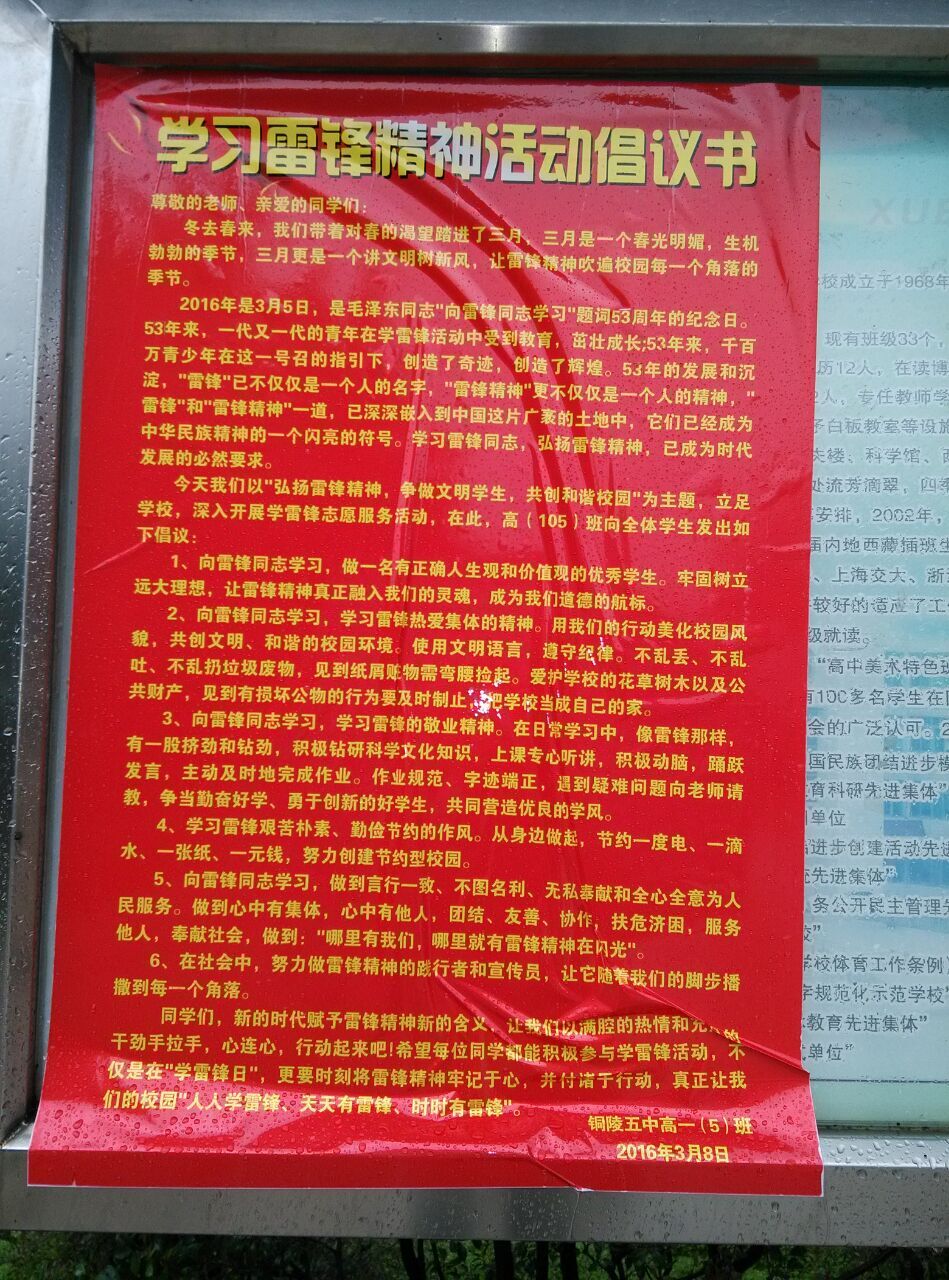 3月初,校團(tuán)委發(fā)出“關(guān)于在全校開展2016年學(xué)雷鋒活動(dòng)的通知”,高105班積極響應(yīng)。7日下午第四節(jié)課,班主任陳盈老師在階梯教室召開了“弘揚(yáng)雷鋒精神,共建和諧校園”主題班會(huì)活動(dòng),號召全班同學(xué)行動(dòng)起來,充分認(rèn)識(shí)到開展雷鋒活動(dòng)的意義,積極用自己的言行踐行雷鋒精神,取得了良好的學(xué)習(xí)效果。5班同學(xué)們很受鼓舞,紛紛表示要從細(xì)處做起,將會(huì)參與各種形式的助人感恩活動(dòng)。