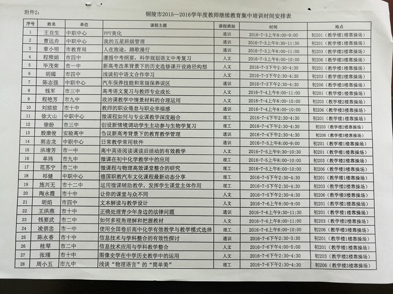 銅陵市2015-2016學(xué)年度教師繼續(xù)教育集中培訓(xùn)將于7月3日-6日進(jìn)行,請各位老師對(duì)照時(shí)間安排表積極參加。本次培訓(xùn)現(xiàn)場報(bào)名簽到,其中1課時(shí)的課程計(jì)繼續(xù)教育2課時(shí),2課時(shí)的課程計(jì)繼續(xù)教育4課時(shí)。