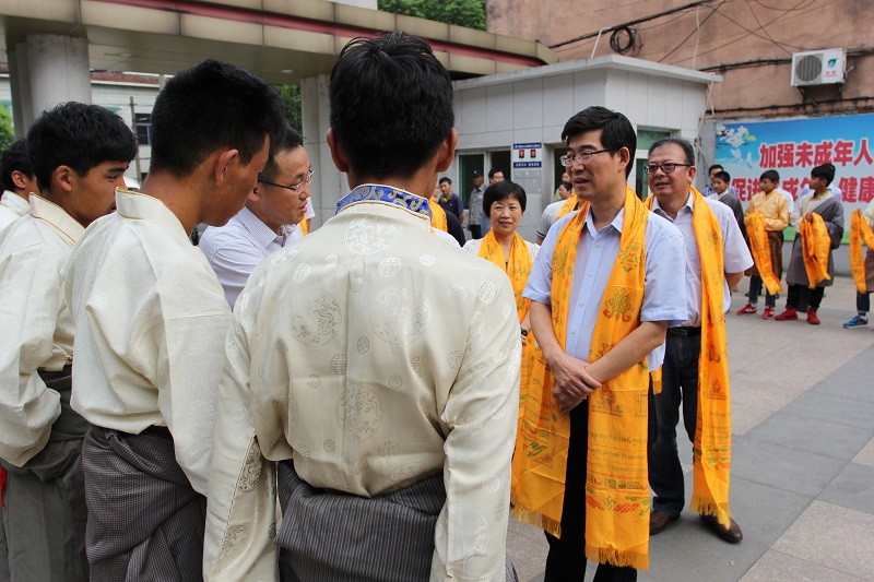 在學(xué)校黨支部書記、校長(zhǎng)沐揚(yáng)的陪同下,李猛書記一行視察了校園,了解了學(xué)校的基本情況,詳細(xì)詢問了學(xué)校西藏班管理、高考錄取和2016年西藏班擴(kuò)招等情況,充分肯定了我校在教育援藏方面所取得的成績(jī)。李書記還與在場(chǎng)的漢藏師生們親切交流,詳細(xì)詢問了師生們的工作、學(xué)習(xí)和生活情況,李書記希望全體教師要牢記要保持崇高的職業(yè)追求,不斷提高師德素養(yǎng)和業(yè)務(wù)能力,做到“學(xué)高為師、身正為范”,推動(dòng)教育援藏和民族團(tuán)結(jié)事業(yè)不斷發(fā)展。李書記還勉勵(lì)西藏生們好好學(xué)習(xí)、刻苦鉆研,用科學(xué)知識(shí)武裝自己,以優(yōu)異成績(jī)報(bào)效祖國(guó)。隨后,李猛書記一行現(xiàn)場(chǎng)為漢藏師生們發(fā)放了慰問品,并與大家合影留念。