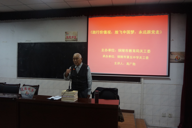 為加強(qiáng)未成年人思想道德建設(shè),深化社會主義核心價值觀教育,扎實推進(jìn)“五老”宣講進(jìn)校園活動,10月28日日下午,由市教育局關(guān)工委主辦、市五中關(guān)工委承辦的《踐行價值觀,放飛中國夢,永遠(yuǎn)跟黨走》主題教育講座在我校階梯教室舉行,主講人是“銅陵好人”、銅陵市道德模范高廣勛老人。市委督導(dǎo)組委員、市教育局關(guān)工委主任王鋼、市教育局宣教科科長丁衛(wèi)東參加了報告會。