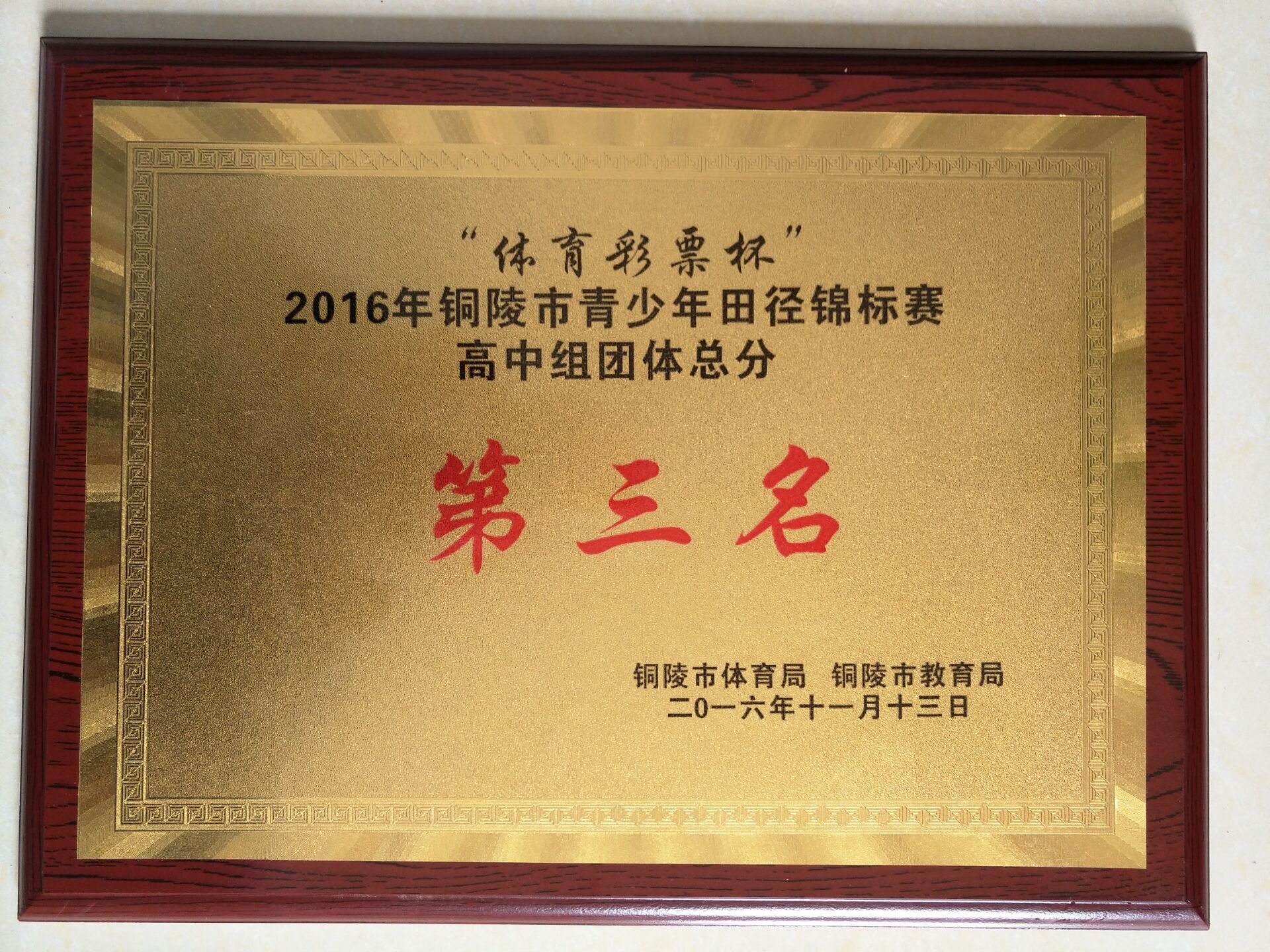 2016年“體育彩票杯”銅陵市中小學(xué)田徑錦標(biāo)賽于11月12-13日在市體育場隆重舉行,大賽分高、初中和小學(xué)共三個組別。我校田徑隊經(jīng)過頑強拼搏,在強手如林的高中組19個隊中獲團體總分第三名的優(yōu)異成績,其中丁梟同學(xué)分別以11秒03和22秒91的成績獲男子