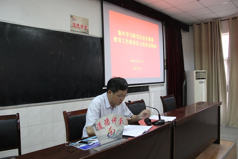 沐揚(yáng)校長(zhǎng)簡(jiǎn)單介紹了陳寶生同志此次到安徽調(diào)研的概況,詳細(xì)全面?zhèn)鬟_(dá)了陳寶生同志在座談會(huì)上的講話精神。沐揚(yáng)校長(zhǎng)要求全體教職工要深刻理解陳寶生同志重要講話精神,將陳寶生同志的講話精神落到實(shí)處,取得實(shí)效,結(jié)合學(xué)校實(shí)際,為努力開(kāi)創(chuàng)學(xué)校教育的新局面貢獻(xiàn)智慧和力量。
