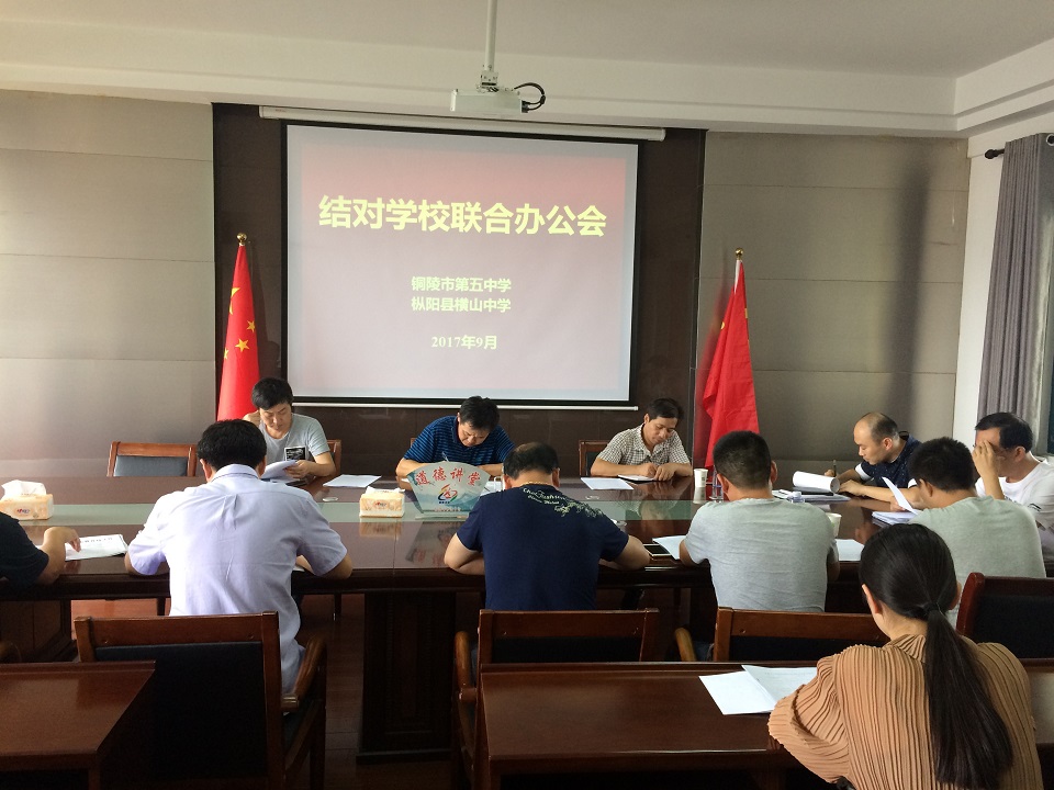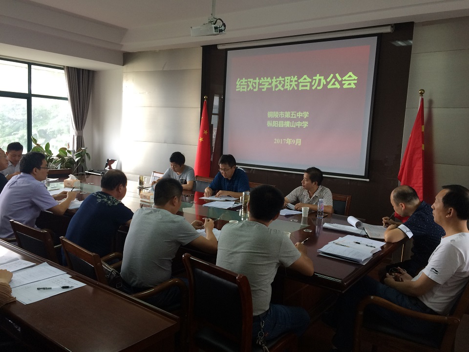9月8日下午,市五中與樅陽縣橫山中學(xué)聯(lián)席辦公會在我校召開。會議由我校黨支部書記、校長沐揚主持,橫山中學(xué)校長吳禮高、橫山中學(xué)辦公室、教務(wù)處和政教處負(fù)責(zé)人、市五中學(xué)校班子成員和中層干部出席了會議。