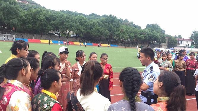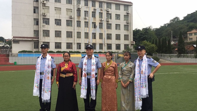 中秋是合家團圓的日子,雖然離家鄉(xiāng)有千里之遙,但我校高二山南班的50名學生卻感受到了家的溫暖。在9月29日的中秋聯(lián)歡會上,銅陵市公安局獅子山派出所民警與西藏生攜手歡唱,共度中秋佳節(jié)。次仁多吉的《心中紅》點燃全場,美麗藏族女孩普布卓嘎,曲尼措姆,尼珍深情演繹《雪域姑娘》,壓軸的鍋莊舞讓在場的民警也情不自禁加入,民警與藏生手牽著手,用歌聲和舞蹈傳達對彼此節(jié)日的祝愿。這場熱鬧非凡的中秋聯(lián)歡會,減輕了西藏生們的鄉(xiāng)愁,也表達了漢藏師生對未來的美好祝愿,更展現(xiàn)了獅子山派出所民警對于校園文化建設的關注,營造了團結和諧一家親的校園氛圍。