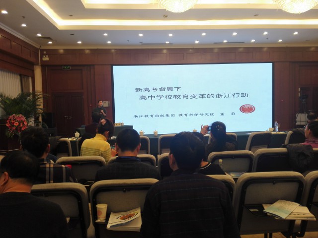 浙江教育出版集團教育科學(xué)研究院秘書長董莉做《新高考背景下高中學(xué)校教育改革的浙江行動》報告,上海新中高級中學(xué)副校長須清明做《分層分類選課走班》報告,兩位向與會人員全面介紹了新高考改革首批試驗區(qū)(浙江省和上海市)的改革實踐情況,包括如何開展生涯教育引導(dǎo)學(xué)生選課、學(xué)生的具體選課情況、走班制教學(xué)班的管理措施和課程安排、高考錄取的新變化等等,也介紹了學(xué)生選課過程中存在的問題、浙江省今年對考試制度的完善情況。