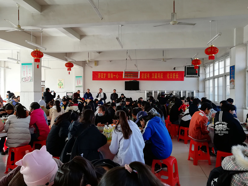 不少同學(xué)還沒(méi)有從校園文化節(jié)眾多豐富多彩的活動(dòng)回過(guò)神來(lái),元旦佳節(jié)又到了。1月1日中午,孩子們?cè)缭绲貋?lái)到食堂,驚喜地發(fā)現(xiàn)食堂已裝扮一新:“辭舊歲 四海一心 惠風(fēng)和暢 迎新年 漢藏同慶 化日舒長(zhǎng)”橫幅高高掛,餐桌上也早已擺放好了豐盛的節(jié)日午餐。除了學(xué)校中層以上領(lǐng)導(dǎo)外,市教育局黨委委員、紀(jì)委書(shū)記張梁特意在百忙之中來(lái)到五中,陪我校西藏生共度元旦佳節(jié)。張書(shū)記鼓勵(lì)大家說(shuō),西藏生都遠(yuǎn)離家鄉(xiāng)來(lái)銅陵求學(xué),很不容易。只要不斷堅(jiān)持,新的一年一定不負(fù)所望,取得佳績(jī)。大家也都備受鼓舞,紛紛拿起手中的飲料,用最誠(chéng)摯的敬意表達(dá)自己對(duì)教育局領(lǐng)導(dǎo)以及學(xué)校領(lǐng)導(dǎo)老師們的感激。一句句“新年好”、“新年快樂(lè)”“羅薩扎西德勒”此起彼伏,吉慶、祥和、熱鬧!